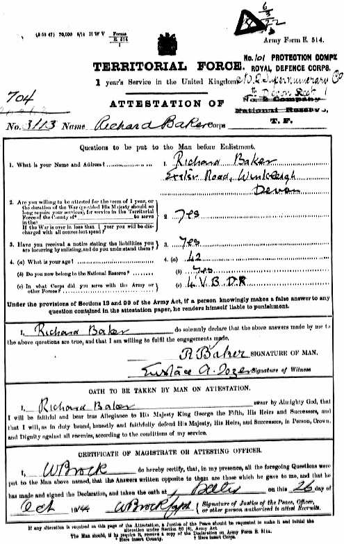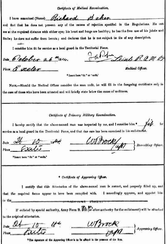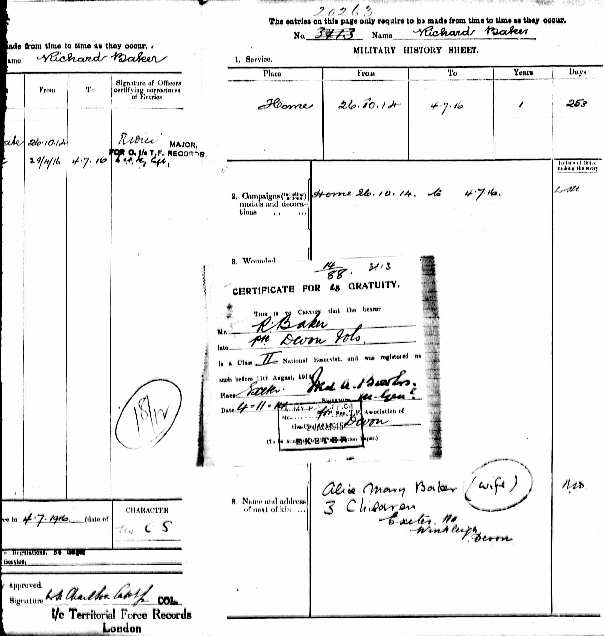 Once the 4th Battalion had left for India Richard Baker took the opportunity on 26th October 1914 of finding a way to serve the Regiment, even though he was even too old to join the nucleus of the 4th Devons who had remained behind to eventually form the basis of a second line battalion, the 2nd/4th. Instead he was embodied, with army number 3133, in the 101 Protection Company of the Devonshire Regiment, trained for Home Service defence in case of a German invasion, an early version of the World War II Home Guard. He remained, of course, at home throughout until his discharge from the army on July 4th 1916, by then aged 43. During this time he received a new number, 20263 which is recorded on his final Statement of Service at that time. He was entitled to a gratuity of £5, as a Class II National Reservist registered before 11th August 1914, which he already received in August 1915.
