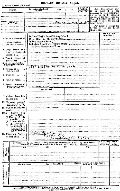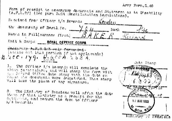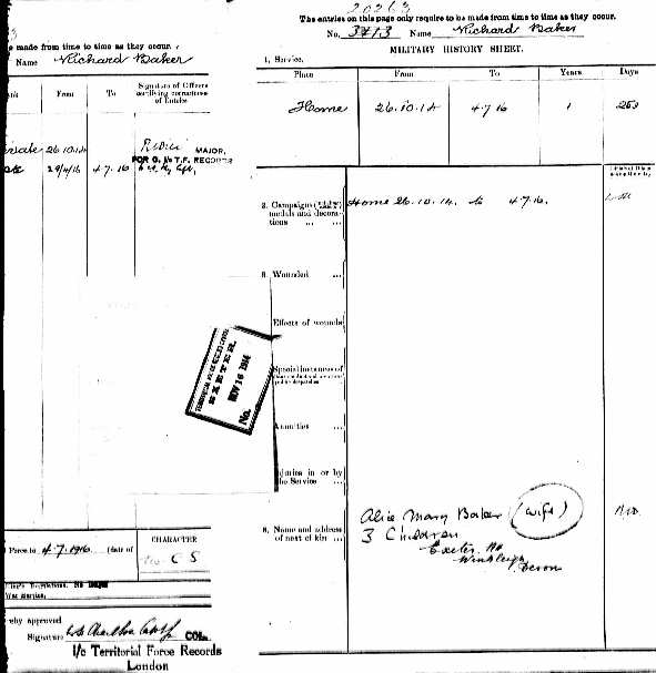 The final document that illustrates Richard’s war service is dated 6th July 1916 when at the time of discharge he applied by letter for a pension to the Royal Hospital, Chelsea, an application forwarded to the O/C 101 Protection Company, 4th Devons. Needless to say the application was rejected, but we can be thankful that the attempt was made. As a result, Richard Baker’s military documents were preserved in Pension Records, and so escaped the London Blitz which had resulted in the destruction at Somerset House of some 75% of the records of soldiers who had served in the First World War.