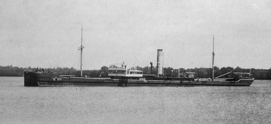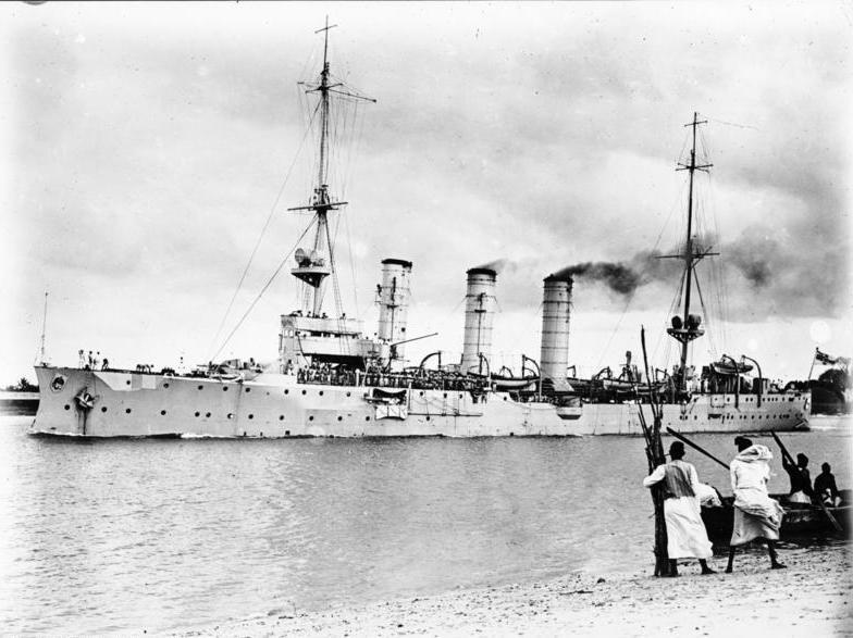 On 2 September 1912, James was transferred to HMS Blanche for a month, then returning to the Temeraire. The Blanche was a scout cruiser designed to operate with destroyers but was not really fast enough. Back on the Temeraire James continued his training and took his examinations, being promoted to Acting Sub Lieutenant on 15 May 1913. On 6 February 1914, James was assigned to HMS Chatham in the Mediterranean where she participated in the pursuit of the German ships Goeben and Breslau. HMS Chatham was a light cruiser launched on 9 November 1911, with a speed of 25.5 knots and main armament of eight 6in guns and a compliment of around 435. In March, James was promoted to Sub Lieutenant. Later that year she was sent to the Red Sea, and in September was sent together with HMS Dartmouth and HMS Weymouth to find and destroy the SMS Königsberg, which had been sinking British merchant ships off the coast of Somalia. By the time the British ships arrived in the vicinity, the Königsberg had again taken refuge up the river Ragifi because of serious engine failure; a common problem with this class of ships which were being recalled to Germany for replacement. When the Chatham arrived off the coast at the end of September, it was discovered that lookout positions had been established, but the location of the Königsberg was soon discovered. With the Königsberg was the collier Somali which the Chatham destroyed on 1st November when the Königsberg moved further upstream. The British did not had detailed maps of the river so were not inclined to follow with their larger vessels, so decided to block the river by sinking the their collier Newbridge (see photo below). At dawn on the 11th November, the Newbridge had been discovered by the German shore defences who started to fire at it. With the Newbridge was the armed steamer Duplex to rescue the crew, a steam picket ship armed with two 14 inch torpedoes to sink Newbridge if her scuttling charges failed and three cutters armed with machine guns and rifles as escort.