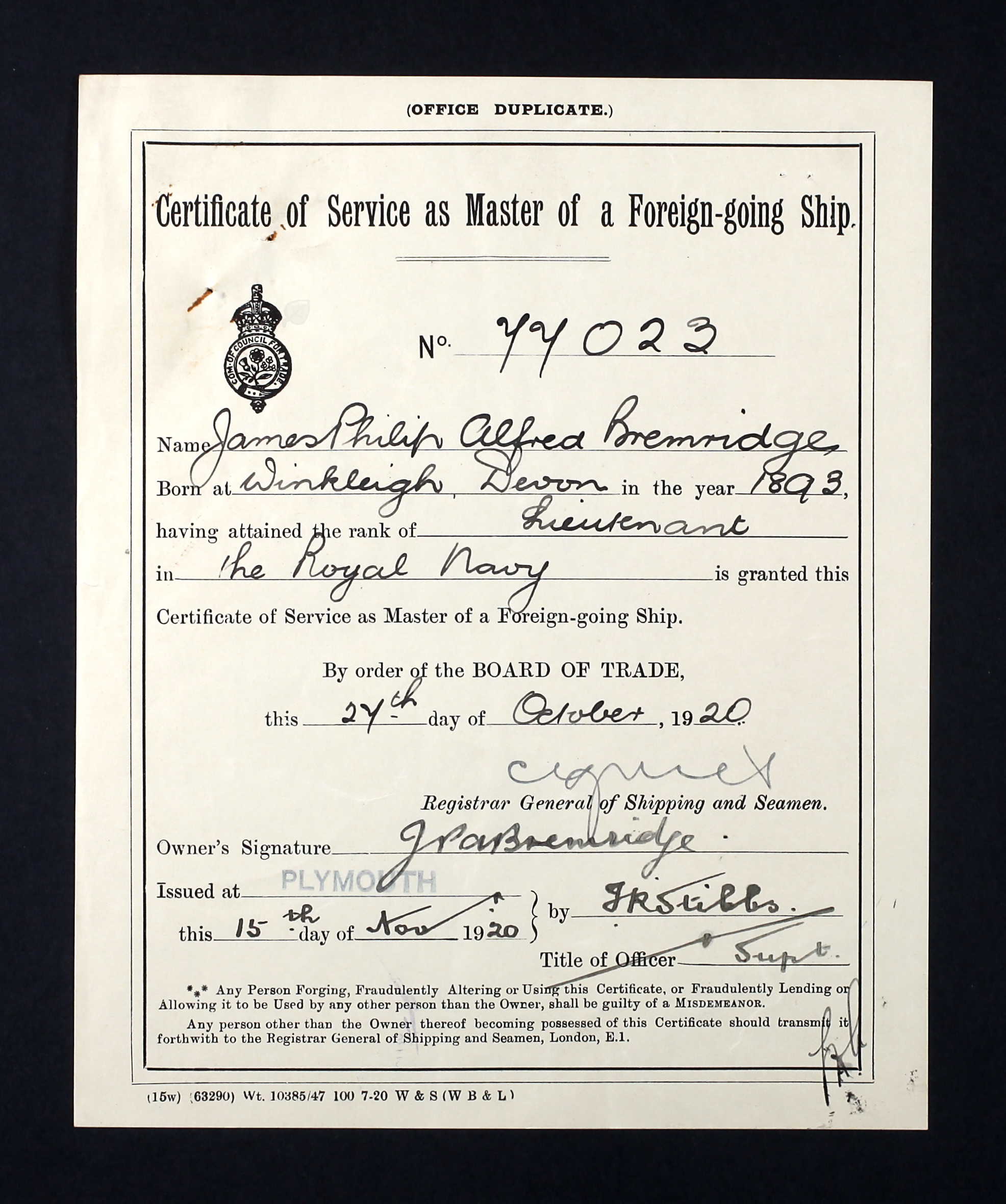 In August 1921 James was granted 5 months leave on half pay so he could go to India with the view of marriage. However, he returned for duty in December. James eventually married Mary Eleanor Isabel Laurence in early 1922 and they had a son, James Philip Henry, about a year later. James continued to get excellent reports and it was noted that he was an excellent motorist and a good tennis player, liking most sports. He was described as short and of slight build but strong. With such a promising future career in the Navy it is with sadness that in September 1926, while serving in Malta as a Lieutenant Commander (G), he was taken ill and admitted to hospital where he died on the 21st of encephalitis. His wife remarried two years later to Col. Norman Bruce Ramsay. James’ son James also joined the navy during World War 2, but died 10 December 1941 in Singapore two days after his ship HMS Repulse was sunk.