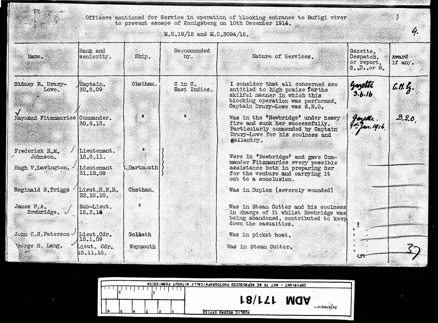 One of these cutters came from the Chatham and was under the command of James. While still under fire the Newbridge was sunk and the cutters rescued the sailors. As a result of his actions, James was mentioned in despatches with the following: “was in Steam Cutter and his coolness in charge of it whilst Newbridge was being abandoned, contributed to keep down casualties”.