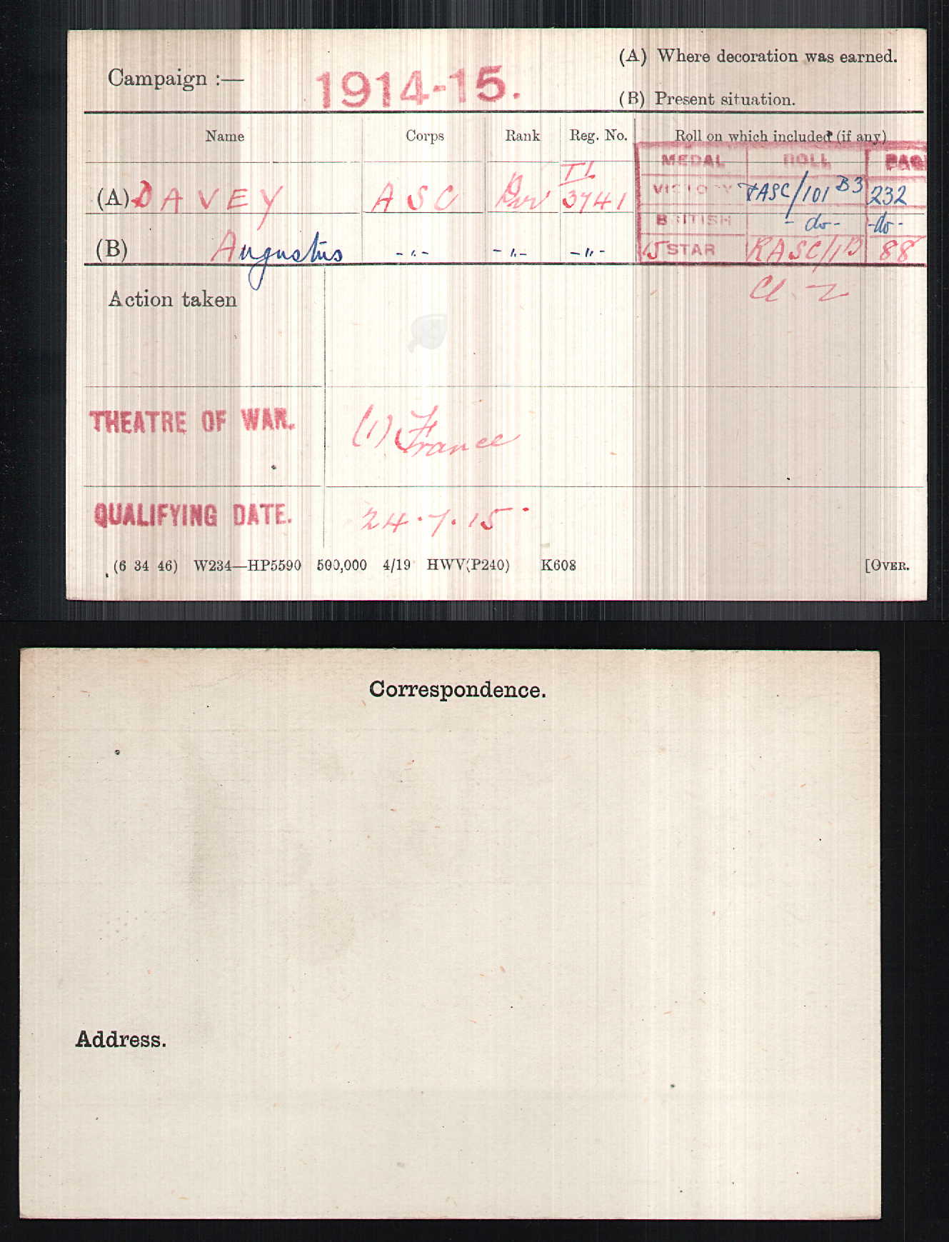 Augustus’ medal card shows that he first went to France on 24th July 1915. Service in France in 1915 was rewarded with the Mons Star, as well as the Victory and British Medals.