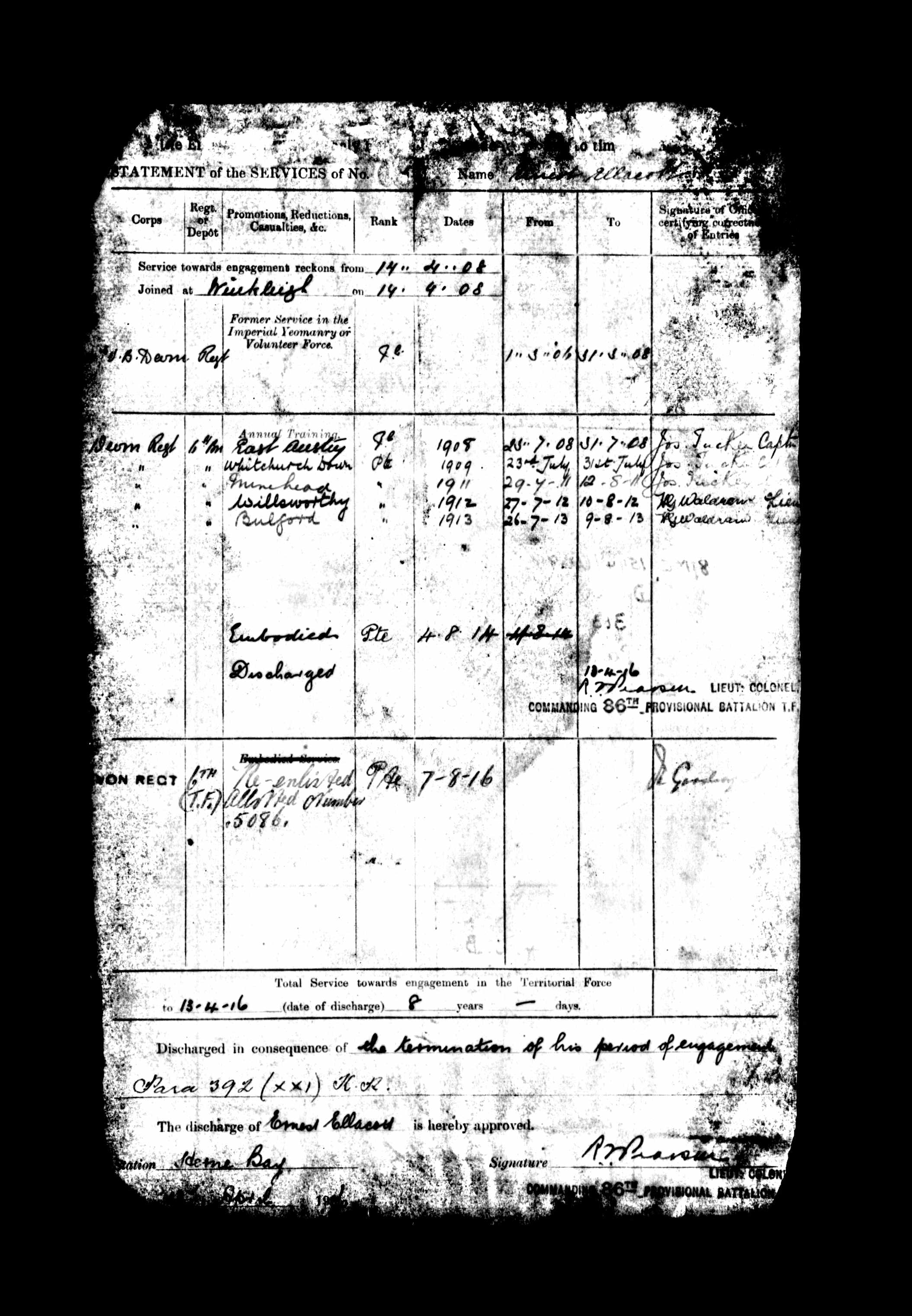 We are extremely fortunate to have a complete history of Ernest’s long army career from the time when aged 20 he first joined the 4th Volunteer Battalion of the Devonshire Regiment on 1st March 1906 with the army number 363, up to the time when he was finally demobbed in 1919. These documents have survived the London blitz which destroyed so many of the soldiers’ records because after the war he applied for a pension and the documents were transferred from Somerset House to the Ministry of Pension records where they survived the bombing. Ernerst’s story is particularly interesting because it is an excellent example of how older soldiers, too elderly to the sent to the front line, nevertheless were given useful work in the army support services. Willingness to enlist, or re-enlist, in 1914 was no less patriotic and valuable as it was for the thousands of younger men who rushed to enlist in the Territorials or Kitchener’s New Army at the start of the war.