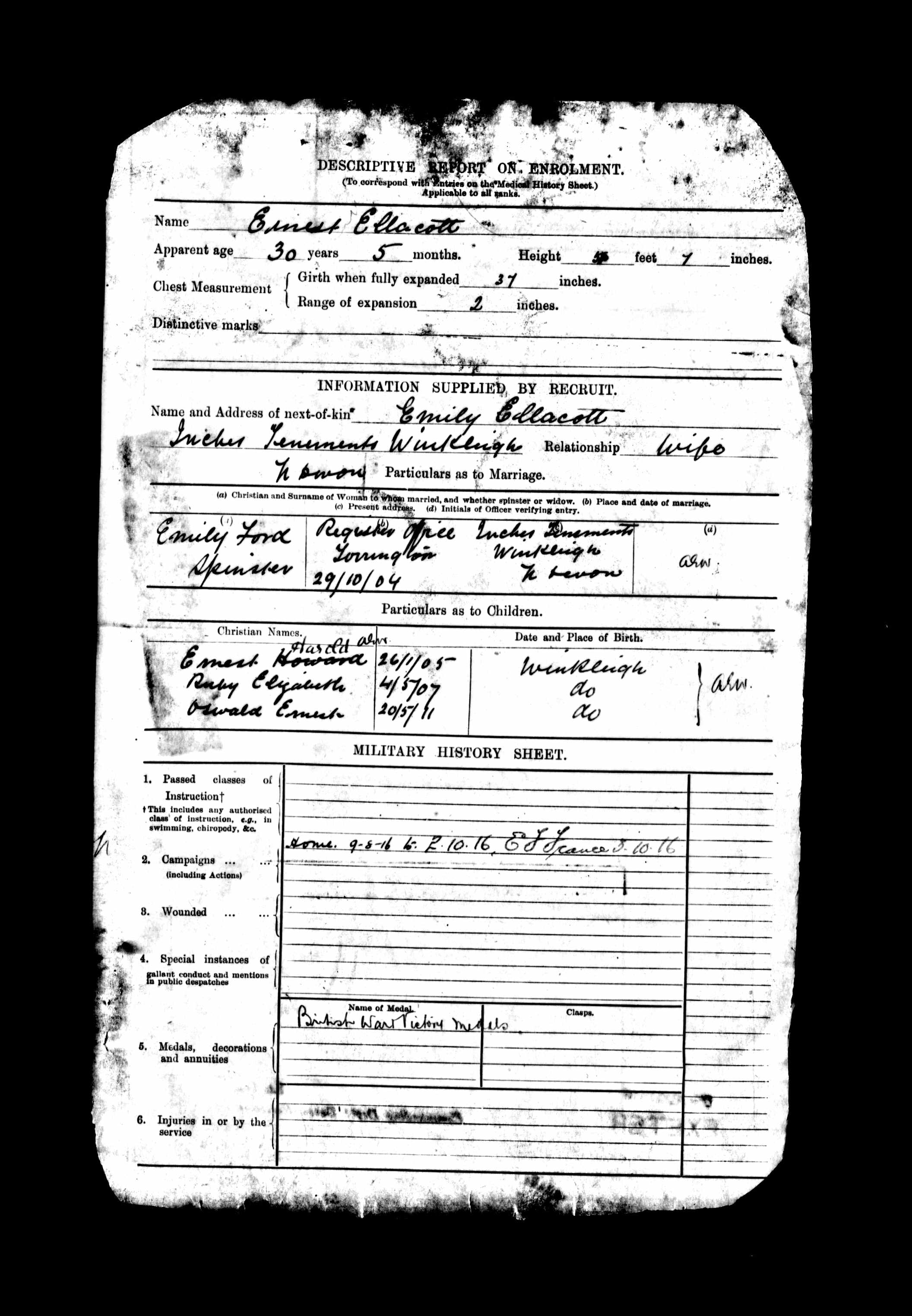 Ernest Ellacott was born in April 1886, the son of Thomas Ellacott, a butcher in Winkleigh and his wife Elizabeth, who in the early years of the century is described as a laundress. The 1901 census records the family as living at Denis’ Cottage, with four children - Emily aged 17 (helping her mother in the laundry business), Ernest aged 15 and working as a labourer, Edith aged 7 and Winifred aged 3. Ten years later the family had moved into the Exeter Road. Elizabeth was now assisting in the butcher’s shop, and other children listed in the 1911 census were William aged 39 who with his daughter Elsie aged 6, had returned to live with his parents, and was a cattleman, Florence aged 17, assisting at home, and Winifred now aged 13 and still at school. Ernest himself, aged only 18, had married on 29th October 1904 at the Register Office in Torrington and was living in Vine Street, with his wife Emily Ford and their two children, Ernest aged 6 and Ruby aged 3. In 1914 he was working as a general labourer for Mr. E.J. Isaac, on the farm at Loosedon Barton.