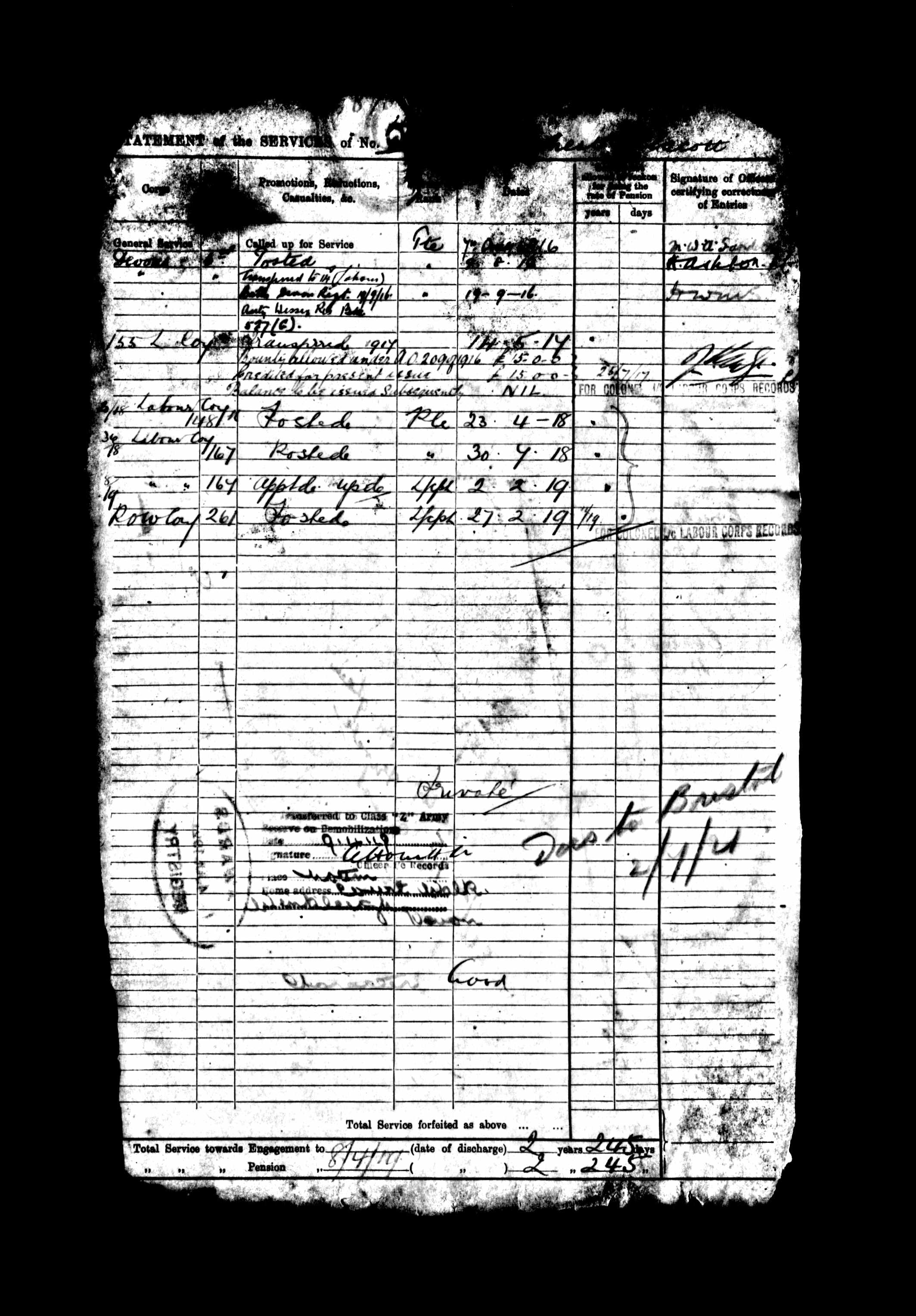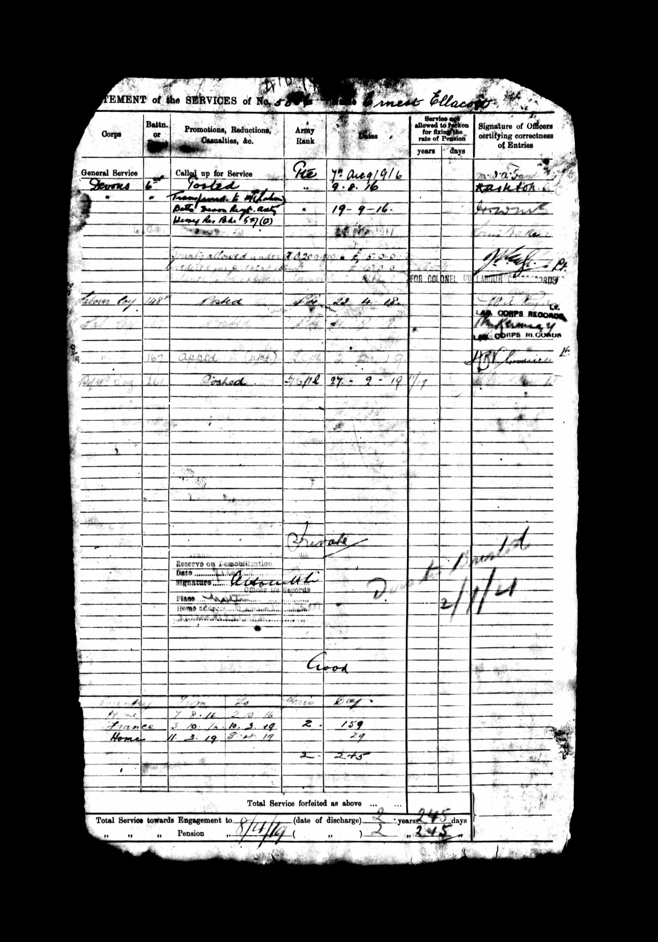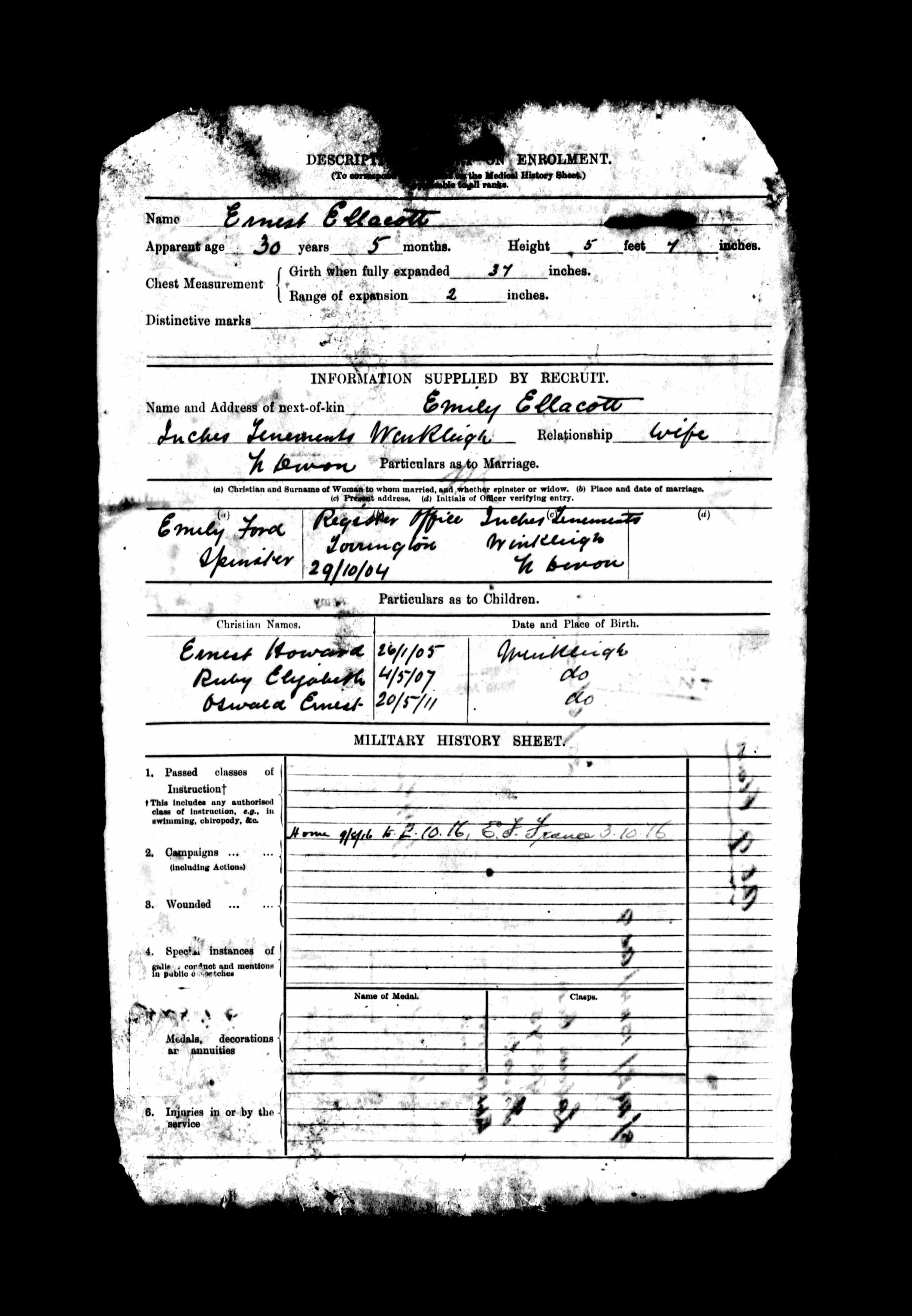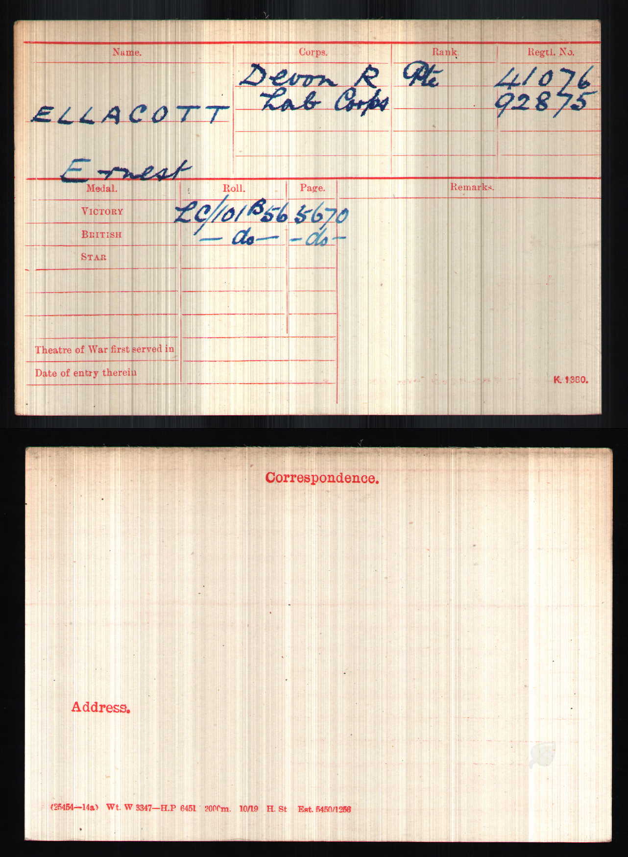 He was indeed recalled under the Military Service Act on 8th August 1916, requesting at the time to re-join the 6th Devons. Instead, he was given a new number, 41076, and posted to the 14th Labour Battalion, Devonshire Regiment, which had been formed in Plymouth that August. The descriptive report on his enrolment lists his address in Winkleigh as ‘Inches Tenements’ The 14th landed in France in October 1916, and it ultimately transferred to the Labour Corps in April 1917 to become the 154th and 155th Labour Companies. Although Ernest’s medal card does not confirm the date of his arrival in France, his military history sheet clearly dates this as October 3rd 1916.