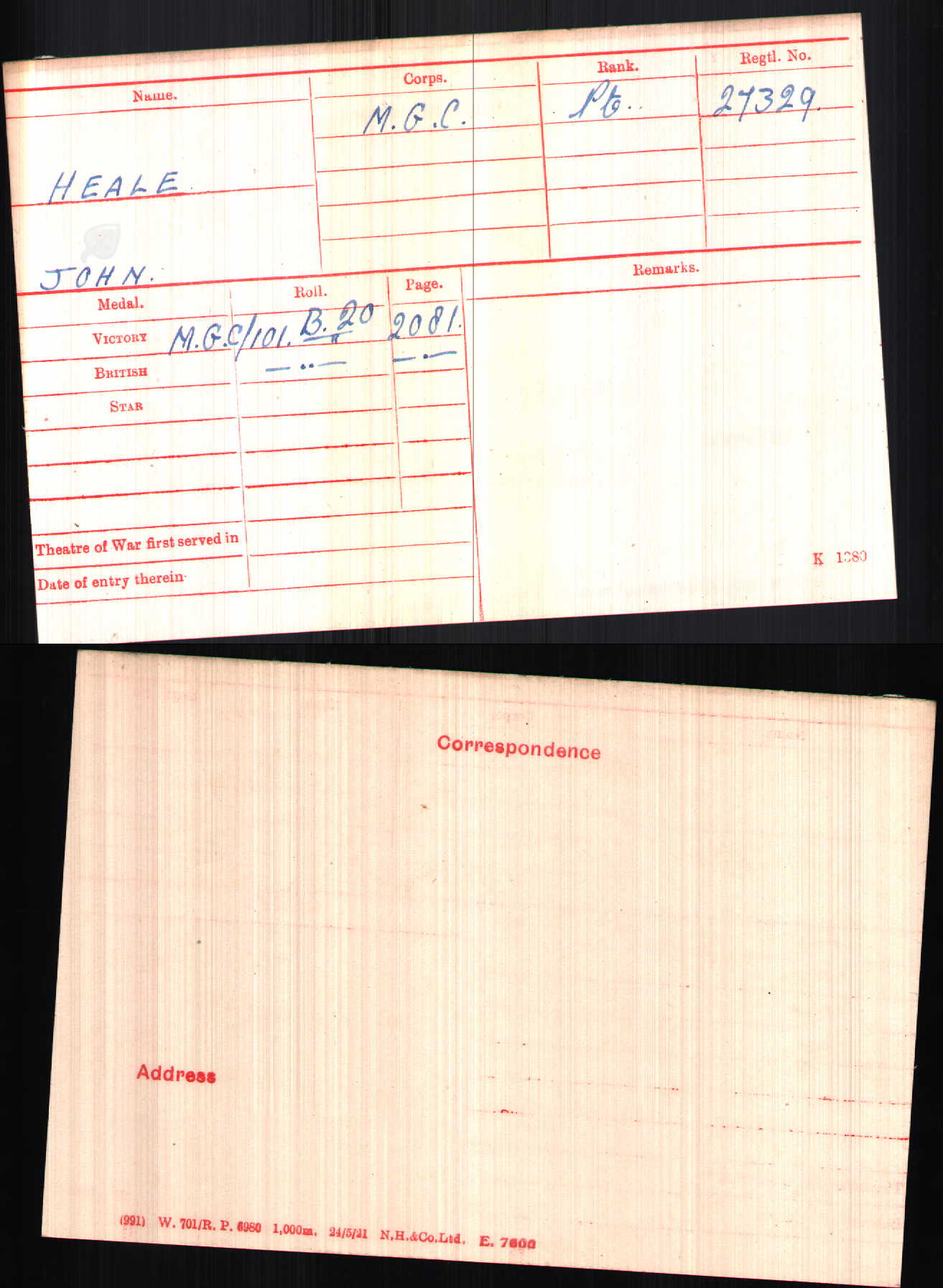 John’s medal card shows his army number and his service in the Machine Gun Corps. If he had joined before October 1915 he would have been enlisted first into another unit or regiment, as this short history of the M.G. Corps explains: sadly, the medal card does not show this, and John’s service records were lost like the majority of these documents, in the London Blitz. John was awarded the British and Victory medals which shows that he was not in France or Belgium prior to 1916.