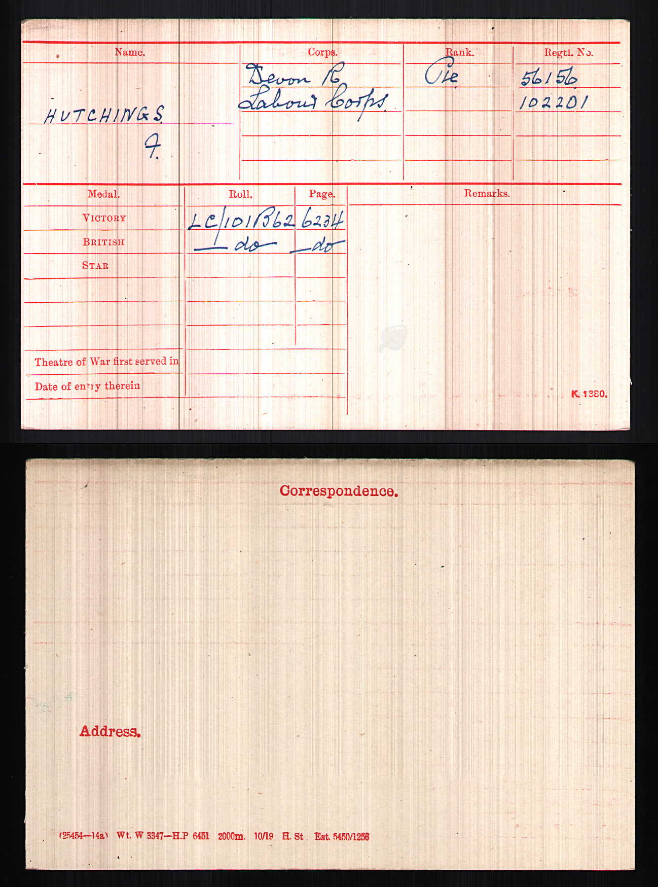 Frank was allocated to join the Devonshire regiment. Successful in this preference Frank would have proceeded for initial training to the 3rd Battalion depot in Exeter, from where he could have kept better in touch with his farm and family in Winkleigh. From there he was either sent as part of a draft to one or other of the battalions in France, or he was transferred at once into one of the Devonshire Labour Companies: we have no clues on his medal card except that he was awarded both the Victory and the British medals after the war, which would indicate some form of foreign service. Frank's military records were destroyed, like so many others, in the London blitz.