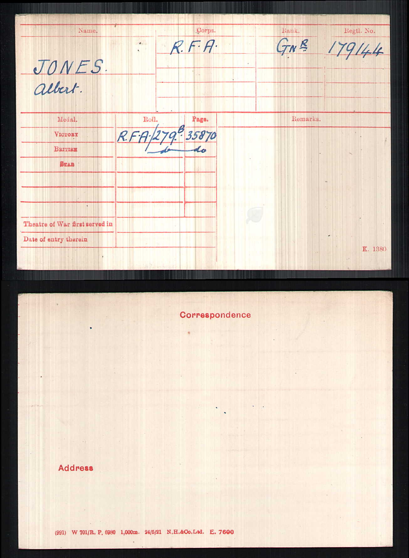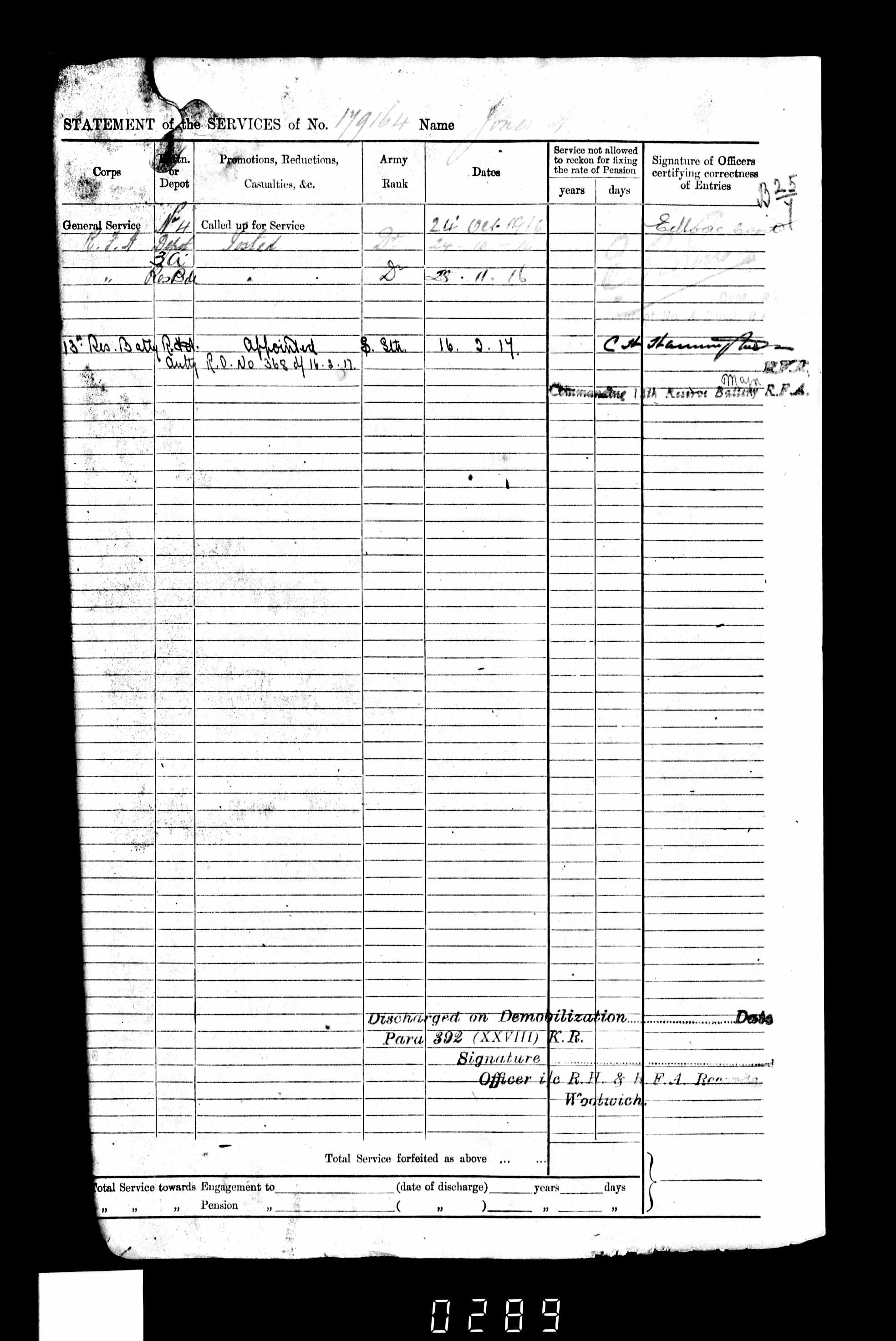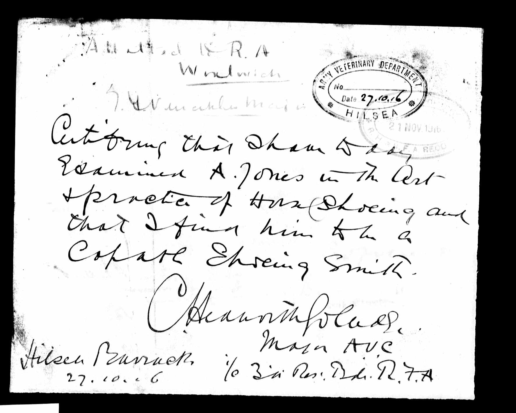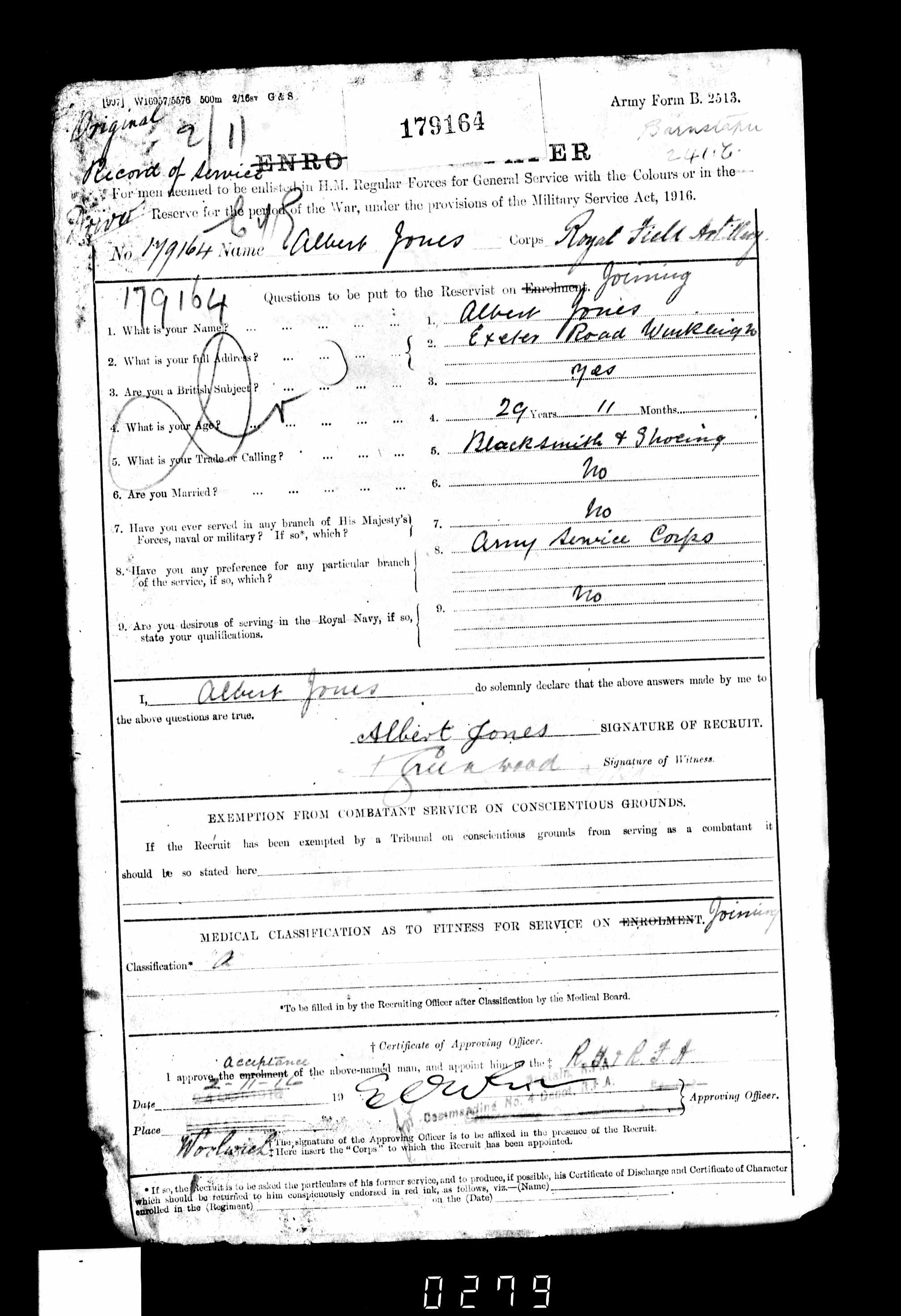 We are extremely fortunate that a number of Albert’s army documents have survived from among the majority of those destroyed in the London blitz, and they give a clear picture of his service both at home and in France. The actual date of his arrival in France is not recorded on his medal card, but it is information we can see on his documents, and we know that he served in the war zone for just over two years. Albert was conscripted (Document 1) under the Military Service Act of 27 January 1916 which brought conscription into play for the first time in the war. It was extended and new conditions implemented in legislation of 25 May 1916, which was known as the Military Service Act, 1916 (Session 2). Together they were known as the Military Service Acts, 1916, to include all men, both married and single, who had been at any time resident in Great Britain since 4 August 1914 and who had attained the age of 18 but was not yet 41. A medical certificate was provided to complete enrolment, (Document 2). Men who failed the medical and enrolment were told they would not be needed again; those who passed, as with Albert Jones, were told they would have another medical when called up. The horse-drawn Royal Field Artillery was the most numerous arm of the artillery, responsible for the medium calibre guns and howitzers, deployed close to the front line and reasonably mobile. It was organised into brigades, with usually 4, but occasionally a varying number of batteries, within each brigade. A battery at full strength numbered 198 personnel (something equivalent to an infantry company within a battalion) which included the battery commander (usually a major), a captain as second in command, with three lieutenants or second-lieutenants each in charge of a two-gun section. To assist in the care of the horses each battery would include a farrier–sergeant and four shoeing-smiths. A howitzer battery would thus include six 5” howitzers, with 16 guns to the artillery brigade, each gun drawn by four to six horses. We are therefore looking at something like a total of 100 horses per battery to be fed, watered and looked after as carefully as possible.