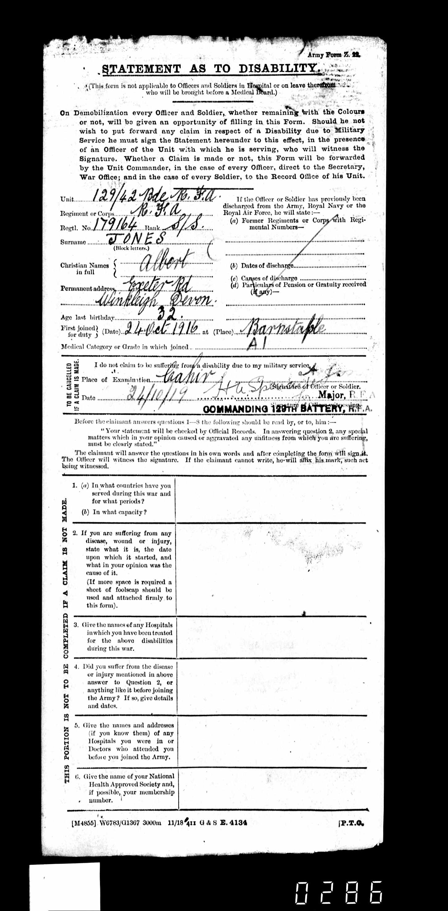 A shoeing smith would usually be needed in any unit right up to the time of the final demobilisation programme. Interestingly, Albert’s Protection Certificate, Document 9 (issued on demobilisation to all men, proving their discharge) mentioned Ireland as the Brigade Headquarters. This means that at some time after March 1st 1919 the 42nd Brigade had been posted from Germany to Ireland. The 42nd Brigade was part of the pre-war Regular Army, and obviously remained so, although it seems likely that the attached 129th Battery (Howitzer) was withdrawn or disbanded, which of course would open the way for Albert Jones’ demobilisation. He was posted to 3A Reserve Brigade at Larkhill on 27th May, and on 12th August posted to the demobilisation camp at Fovant where he had to wait his turn. Demobilisation finally took place on 2nd November 1919. Albert was given 28 days’ paid leave and £2 advance of pay, together with a rail warrant to return to Winkleigh.