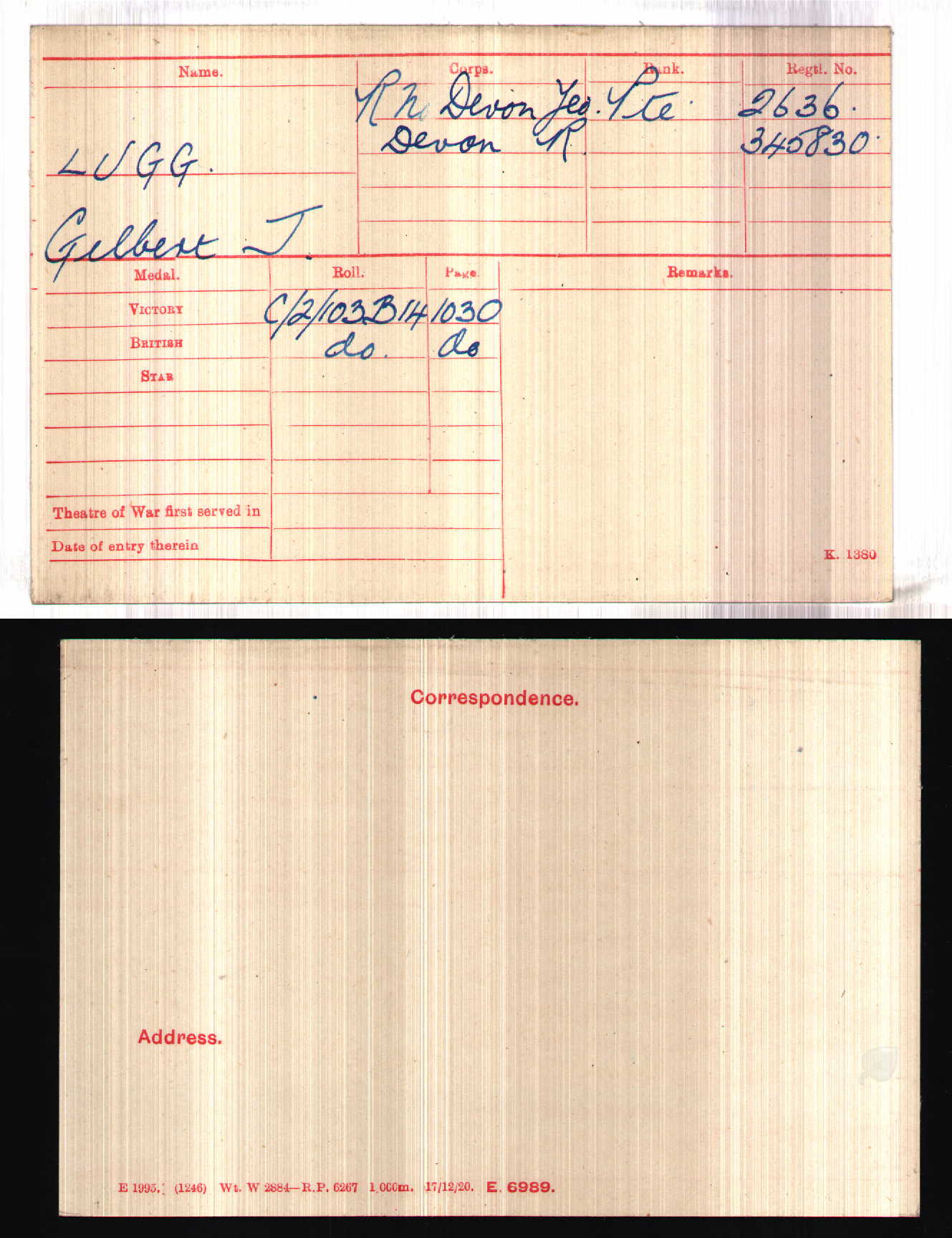 The Ashreigney Deanery Magazine listed in the September edition the names of the first to serve in Winkleigh, among them Gilbert Lugg in the 1st/6th Devons Territorial battalion. However, his medal card also shows that he had also served in the Royal North Devon Yeomanry, possibly as a Territorial before the war, before being posted or re-enlisting in the Devons Territorials. One can possibly imagine that with so many of his friends joining together into the 1st/6th Devons, Gilbert might have been attracted to leave the Yeomanry and join them. Sadly, his military records were lost, like so many others in the London blitz, so we know no more. Attachments to this site include information on the 1st/6th Devons in the war.