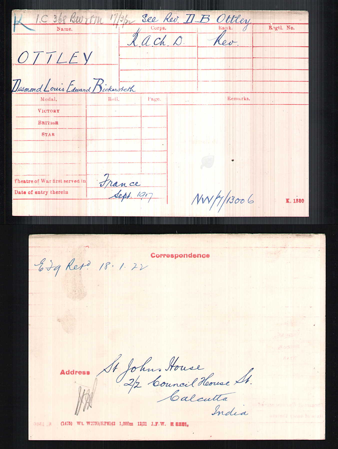 Desmond’s medal card reveals his address to which his medals were sent in 1922: St. John’s House, 2 Council House Street, Calcutta. A daughter was also born in 1920, Mary E. B. (presumably Bickersteth) Ottley. Serving on the staff at St. John’s Church, Desmond was also described as ‘a chaplain on the government staff’, as reported widely in the North Devon Journal, the Western Times and the Exeter and Plymouth Gazette.