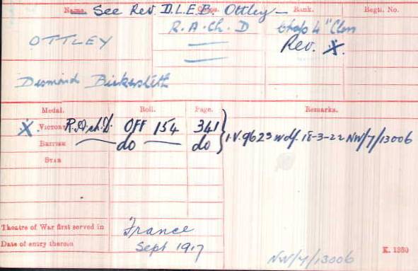 Thanks to this address we can trace the outline of Desmond Ottley’s war service. The 4th/B Reserve Brigade of the Royal Field Artillery was certainly in camp at Boyton, and contained numbers 22, 23 and 24 training batteries. Both his medal cards record that Desmond Ottley first went over to France in September 1917, and the Chumleigh Deanery Magazine gives us further clues as to his whereabouts.