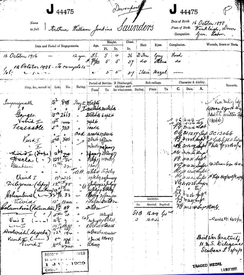 HMS Hope was an Acorn Class destroyer with the 2nd Destroyer Flotilla. The Destroyers were always busy throughout the war, escorting convoys and on patrol generally, because although the Navy blockade of the Germann Navy and shipping remained generally effective, there was always the threat from German submarines. Six weeks after the Battle of Jutland at the end of May 1916, the Grand Fleet had left Scapa Flow again, but lost both HMS Nottingham and HMS Falmouth to torpedoes from submarines. From then on, the Grand Fleet also had the added protection of destroyers against submarine attack. The log of the Hope has not been referenced for specific incidents during the time Arthur was aboard which was for just over two years during the war. At the end of the first year Arthur had his annual assessment. For seamen, these were mostly limited to a judgement on Character and Ability, which were usually given as ‘Very Good’ and ‘Satisfactory’. Although this had been the case with Arthur, he now received ‘Superlative’ for Ability. As he continued to get this report for the rest of his Service Record (shown on the right, which runs up to 1928), one can suggest that his potential had been seen soon after he joined the Royal Navy and so was subsequently selected to go to HMS Ganges for further training rather than stay at Devonport. Arthur was promoted to Able Seaman 0n 12th February 1917 and continued in that post until the end of the War. During this time, the Hope was in the Dardanelles where she was in collision with the Arno in March 1918. The Hope went to the dry dock Leghorn (Livorno), Italy for repairs and Hope’s football team had a match against Italian naval students there. On 19 February 1919, Arthur returned to Vivid, the shore establishment at Devonport, on 19th February 1919 for further training before his next assignment to the destroyer HMS Sepoy on 1st July 1919. There followed subsequent postings to destroyers Seypoy, Seabear, Volunteer and Scythe with occasional periods back at Vivid in Devonport, as shown in the Service record up to 1928. During this time his eyes changed colour from grey to blue and then to hazel, and his hair eventually became fair.