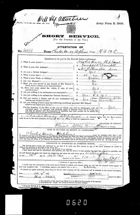 Charles Henry Stephens was born in St James Westminster early in 1894, the third child Robert Stevens who was a policeman who came from Sampford Arundel, near Wellington in Somerset. Robert had married Mary Ann Blackmore Cruse, also from Sampford Arundel, and continued to work as a policeman in the London area and enlarged the family to four children, Thomas, Mary, Charles and Lucy. However, by 1911 Robert, now age 53, had been retired from the police service with a police pension and the family was back in Sampford Arundel. Charles was working as a houseboy, age 17, for a retired farmer and his wife in Washford near Watchet in Somerset. When Charles enlisted in October 1915 he gave his profession as a groom and his address as his family home in Sampford Arundel. However, he was almost certainly working and living in Winkleigh at this time and courting Florence Ida Woolacott whom he married early in 1916 before he went overseas. Florence came from the well-known and long established Woolacott family in Winkleigh, and the couple settled in Labarre Cottage in Church Lane in the village. Thus it is surprising that his name is not on the Roll of Honour in the church after being on the temporary Roll being kept up to date and displayed in the church during the war.