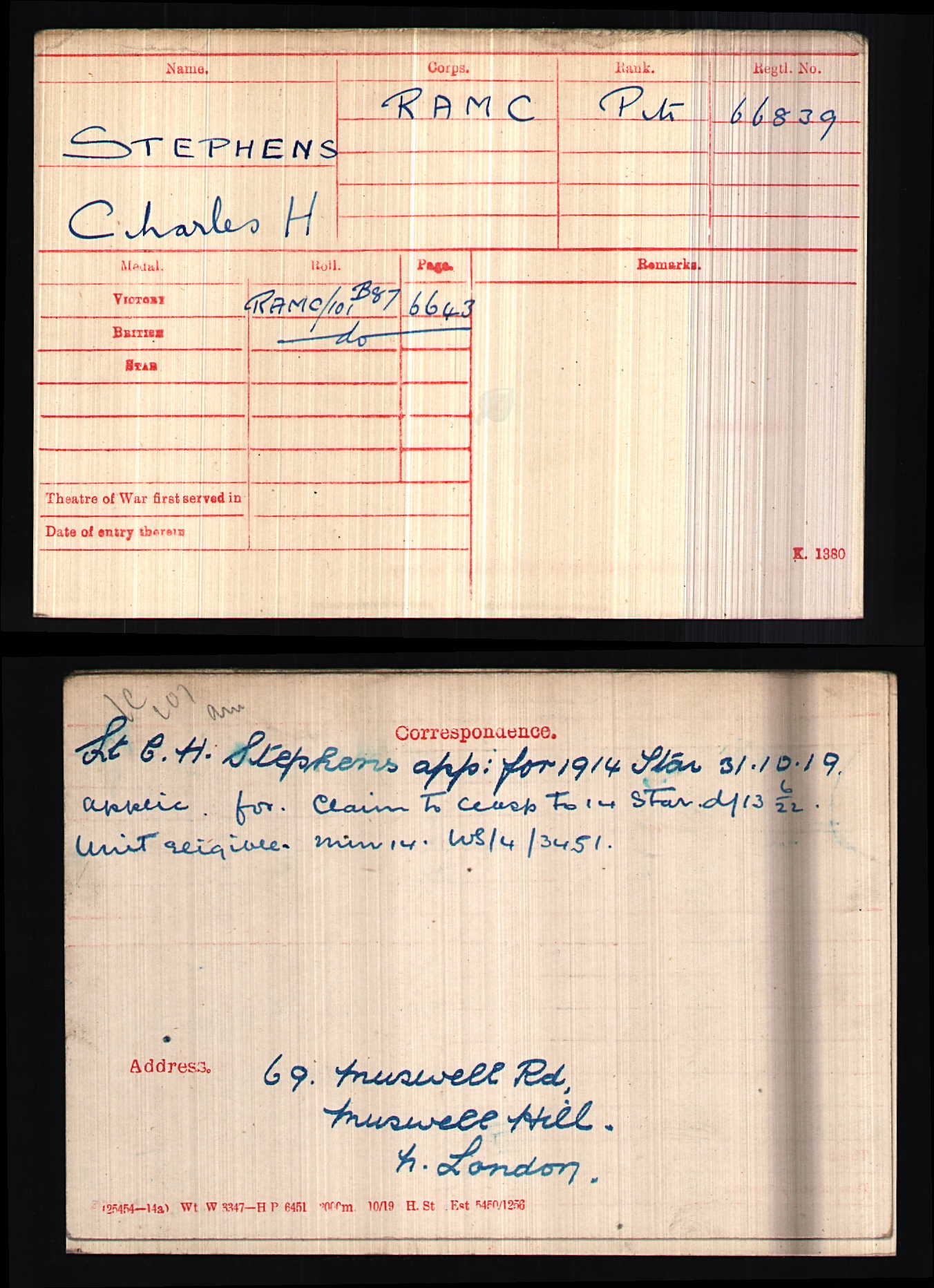 Various items in the surviving documents give indications of Charles Stephens’ life after the war ended. He had returned to England to spend some time in hospital before being transferred to a home depot of the R.A.M.C., now classified as B2 (in fact fit for Home Service only), the 406 Field Ambulance, probably a training establishment. He was ‘demobbed’ on 11th June 1919, having served in the army for a total of 3 years and 242 days. He was awarded the usual Victory and War Medal. Obviously proud of the contribution he had made, marked both by his award of the Military Medal as well as the numbers of lives that he had been involved in saving, he hoped that he would also be awarded the 1915 Star as a reward for his attestation on 12th October 1915. The application was rightly refused; the Star was awarded only to those who had served in France or Belgium between 1914 and 1915, and the rejection is recorded on his medal record card. However, it is by mishap that the award of the Military Medal was omitted from the same roll. Having applied, it was sent to him on 18th September 1918, presumably while serving in the 406 Field Ambulance, and a full year after it was earned. The address shows that his wife was still living in Winkleigh at that time, at the home to which he returned after demobilization, Labarre Cottage in Church Lane.