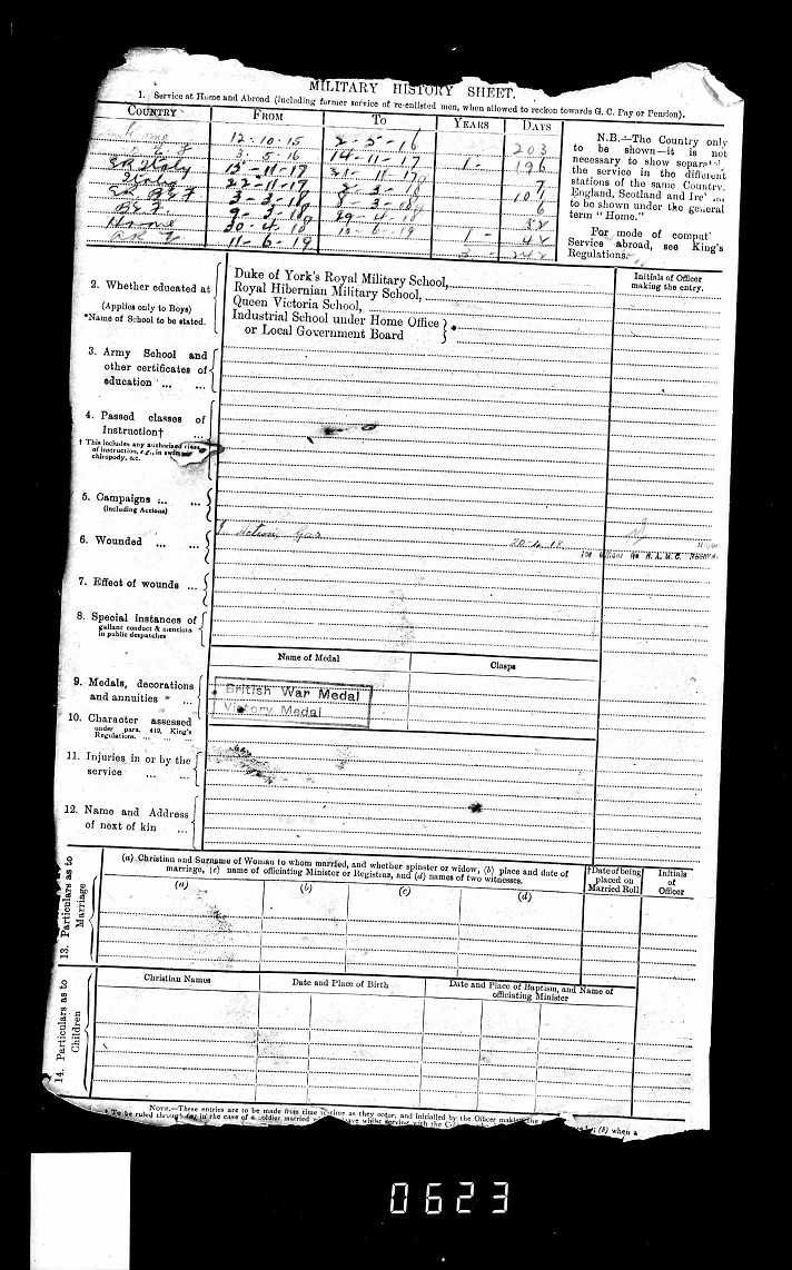 From his service record sheet (Locations and Medals) we know a great deal about his movements and the very full part that he played in the war before being gassed on 20th April 1918, and his return to Home Service, having had his medical status reduced to B II. He was to live on another 25 years, dying in 1943 at the age of 49, a life no doubt curtailed by the effects of the war.