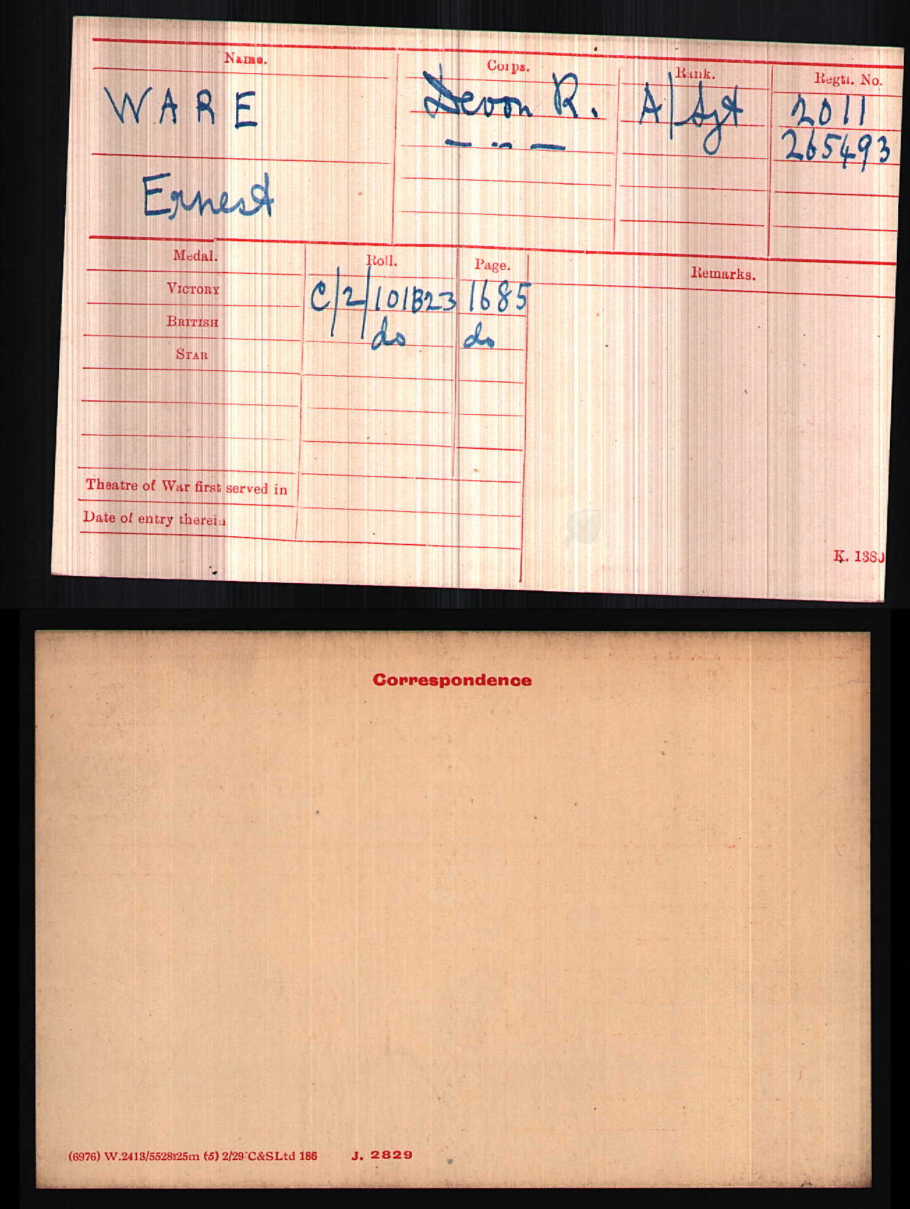 The additional information on the history of the 1st/6th Battalion is attached to this account. It is practically certain that Ernest Ware would have embarked with the battalion on 9th October, but without further information from family sources his subsequent experiences are unknown. However, his second army number, 265493 gives a clue. Men who had enlisted (or who had already enlisted pre-war) directly into a Territorial unit, and were therefore not subject to the Military Service Acts (conscription) of 1916 were given new army numbers on 1st March 1917, by an Army Council Instruction published on 23rd December 1916. Each corps of Infantry was allocated a block of numbers starting at 200001. The allocation for each infantry corps was then broken into smaller blocks for each battalion. Those men who had enlisted in a Territorial Army 4th Battalion, for example the 4th Battalion of the Devons (the senior Territorial Battalion in the Devonshire Regiment), were allocated numbers 200001 to 240000, those of the 5th Devons 240001 to 265000, and so on. From Ernest’s number 265493 it seems likely that he was still serving in one of the 6th Devons battalions, which were numbered from 265001 to 290000. It is interesting that the new number follows in sequence his younger brother Arthur’s new number 265492.