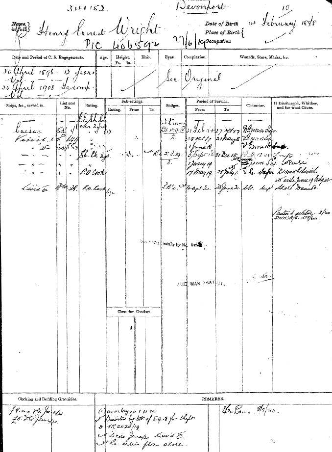 It was not until 28 October 1917 that Henry returned to Vivid at Dartmouth where he stayed for the rest of his naval career. Although he had seen some operational deployment at the beginning of the war, he must have spent a relatively safe and enjoyable time during the war. His conduct had been reported as superlative from very early on, so it is surprising that in September he was found guilty of theft and lost six months seniority. His conduct returned to superlative and in 1919 he was promoted to Petty Officer Cook and finally left the Navy on 23rd June 1921.