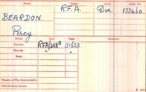 133460 Driver Percy Beardon, 27 Reserve Battery. Lost at sea, commemorated on the Hollybrook Memorial, Southampton.