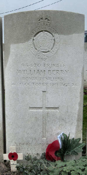 Private Berry had died just two days after the Battalion came out of the line. He lies in a marked grave in the Haringe Military Cemetery 18 km west of Ypres outside Poperinghe. His grave lies near the road, just on the left-hand side by the entrance, obviously one of the first to die from the casualties that began to arrive on and after the 1st October, to be buried in the new plot reserved for the incoming 36th CCS.