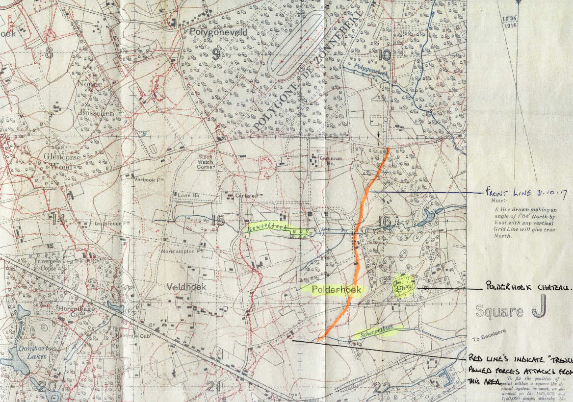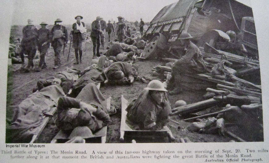 By 9.45 am the Polderhoek Ridge had been rushed, and here the battalion halted to reorganize the line and to ensure that its left flank connected with the 9th Division Ahead of them the advance continued, and the 88th Brigade captured Gheluvelt by 10.30. The battalion then moved down the Menin Road, in echelon, and took up positions outside the village. At 5.00 pm new positions were taken in front of the Gheluvelt Ridge as the defensive flank to the Brigade. The day had been a relatively easy one. The Battalion had suffered very few casualties, and had captured about 300 prisoners, several machine guns, a complete battery of 5.9s and a few 77mm guns. Some of the machine guns captured had been mounted on top of the pill boxes, but the Germans were in no mood to get themselves killed.