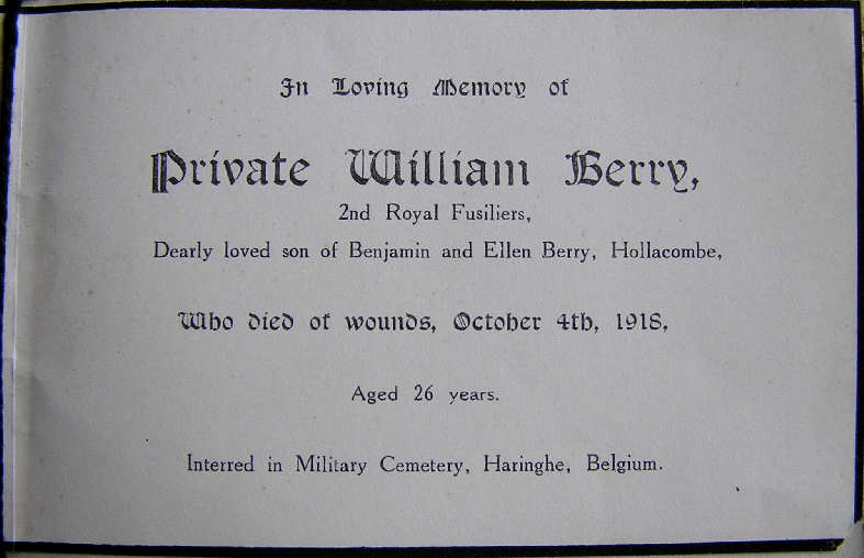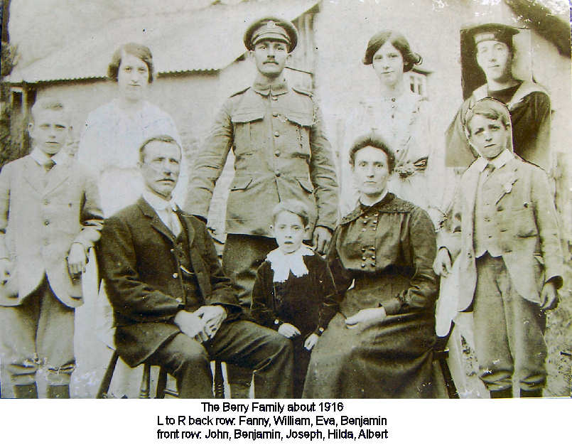 William Berry, the eldest child of Ellen and Benjamin Berry, was born in 1892 into a large family of eight children living in Hollocombe. The 1901 census describes Benjamin as a thatcher born in Winkleigh, and his wife Ellen Cockram born in Wembworthy. Benjamin’s mother, Mary Ann, a 75 year old widow, was also living in their cottage together with the first four of the children, three of whom were at Hollocombe School. It must have been a crowded household. By 1911 three more children had been born, and Mary Ann was still surviving now aged 84. The eldest girl, Fanny, had moved out to live as a servant to Ada and Frank Farleigh, the Hollocombe grocer, and William, now aged 18, was a horseman on Higher Narracott farm, Ashreigney, farmed by William Tout. The youngest child Joseph, in the centre of the family photograph, was born about 1912.