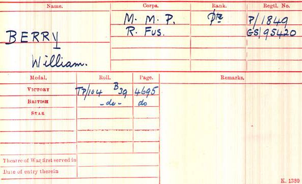 William Berry did well to enlist in the Military Mounted Police, a reasonably safe but at the same time an interesting and exciting job. Members of the Military Mounted Police were usually drawn from cavalry regiments, but as in the case of William Berry others were enlisted who showed particular skill in handling horses. During the Great War the Corps of Mounted Police contained no battalions or companies, so that it is virtually impossible to trace the records of any group of individuals by the means of war diaries or secondary sources. When the British Expeditionary Force was sent to France in 1914, each division had one Assistant Provost Marshal in the rank of Major, and each Corps a Provost Marshal, who held the rank of Colonel until 1915, and a Brigadier-General thenceforward. The original establishment of Mounted Police to various units was 6 persons to a Corps Headquarters, 25 to each cavalry division, and 25 to each infantry division. In order to give individuals the power to arrest, there was no rank of private in the corps, all new enlistments starting at the rank of Acting Lance-Corporal. With this authority came great status and a uniform which included the famous ‘red cap’ - the red band around the hat - and a red sash on ‘dress’ occasions.