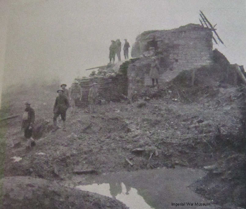 On the night of 27th/28th September the battalion had moved by train from Brandhoek where they had been in the last stages of their divisional rest, up to Ypres, and were billeted in the vicinity of the school. At 4.30 am on the morning of 28th they moved into their assembly positions for the attack. Zero hour was at 8.30 am, and aided by thick morning mist the battalion moved forward behind the artillery ‘creeping’ barrage, in support of the 1st Royal Dublin Fusiliers, two companies in the front wave, two in the rear. The first objective was captured by the 1st Lancashire Fusiliers at 7.08 am, and the 2nd Royals, still behind the 1st Dubliners, passed through their position. As they moved forward, opposition was encountered from various pillboxes on the Stirling Castle Ridge, and the advance was held up because the artillery barrage was falling too short to make headway. Although the morning mist was of great help at the start of the attack, the enforced halt brought confusion, and the battalion became somewhat mixed up with the Dubliners, but eventually both battalions moved on together to reach the Clapham Junction Ridge. The Germans were in no mood for a real fight and soon the machine gunners manning the pillboxes on the Ridge were surrendering freely as they were mopped up. X Company took 40 men and their guns, while those who were reluctant to emerge from a dug out were quickly killed. As the battalions pushed on, more prisoners emerged. The Dubliners then took cover and the battalion passed through them, taking more prisoners as they advanced towards the Polderhoek Ridge. Further pillboxes were rushed and more prisoners surrendered, including an officer, a Sgt.-Major and 48 gunners who were taking shelter rather than put up any resistance with their battery.