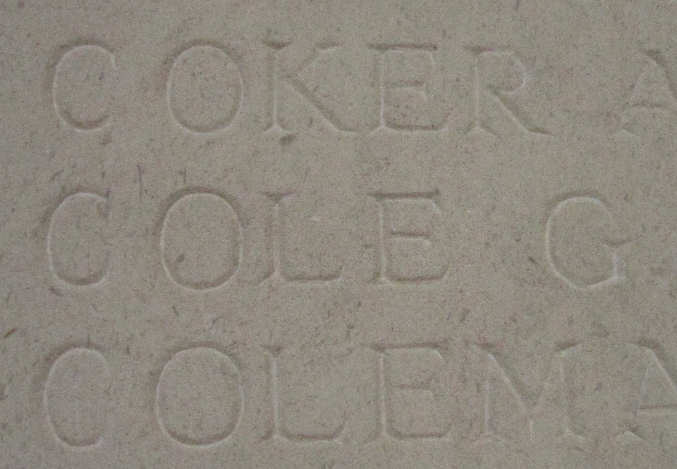 Private George Cole had managed to survive until the night of 31st September, but early in the morning of September 1st, during the course of the relief, he had been killed by shell fire. His body was of course never found, and his name is recorded on the Vis-en-Artois Memorial which commemorates 9,822 men with no known grave who fell in the advance between 8th August and 11th November 1918 in Picardy and Artois between the river Somme and Loos. Vis-en-Artois village lies on the straight main road from Arras to Cambrai about 10 kilometres south-east of Arras, at a point where the road crosses the River Sensee. It is very near to the actual place where George Cole was killed moving back north of the road from the position at Eterpigny to the reserve lines at Monchy-le-Preux. The Memorial, which is the back drop to the Vis-en-Artois British Cemetery, is in three parts, the concave screen wall carrying the stone panels on which the names are carved. It is 26 feet high flanked by pylons 70 feet high. The Stone of Remembrance stands exactly between the pylons and behind it, in the middle of the screen, is a group in relief representing St George and the Dragon. The flanking parts of the screen wall are also curved and carry stone panels carved with names. Each of them forms the back of a roofed colonnade; and at the far end of each is a small building.