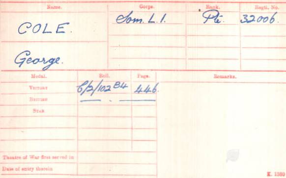 Once in the army, George would have carried out his initial training in the 3rd (Reserve) Battalion of the Devons in the Exeter depot before being drafted. The initial task of the 3rd Battalion, the Regiment’s training battalion, was to keep the two regular army 1st and 2nd Battalions, up to strength. The early demands for drafts were insatiable, so great were the casualties in the first months of the war, Between January 1st and April 30th 1915 no less than 675 other ranks were drafted to the 1st Battalion, and 795 to the 2nd. 34 officers were also drafted, some to battalions other than the Devons. In those early days, recruits flooded in to the 3rd Battalion to replace those drafted and in far greater numbers than could be housed, equipped, trained or even supplied with uniforms, rifles or basic military equipment. As the war went on, of course, these difficulties were overcome, and the steady flow of officers and other ranks through the battalion throughout the war never ceased - new recruits, officers and men being returned for duty after sickness or having recovered from wounds, and newly-gazetted officers from Sandhurst or the Officer Cadet battalions (for example the Public Schools Battalion). From early on in the war the exclusive nature of the 3rd Devons, in common with many 3rd Battalions of other Regiments, began to break down, as battalions in urgent need of reinforcements were sent drafts from regiments other than their own. It was in this way that George Cole, having been enlisted in the Devons, found himself posted instead to the 1st Battalion Somerset Light Infantry.