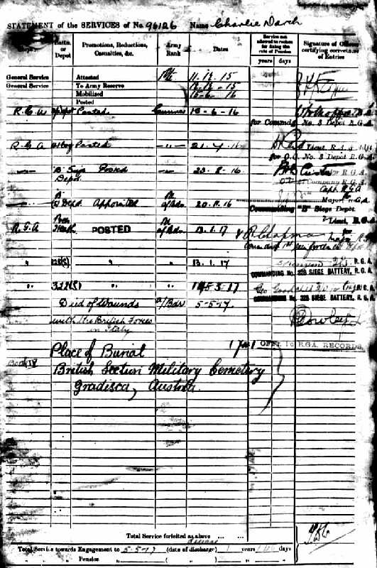 Having attested on 11th December 1915 the document ‘Statement of Services’ gives us a record of what happened next. Unmarried, at the age of 23 years and 7 months, Charlie might have expected a fairly short wait before enlistment but in fact it was a full six months before he was called up. Officially in the ‘army reserve’ he was mobilized on 15th June 1916 and posted for basic training to No.3 Depot, RGA, at Plymouth. This lasted 4 weeks, consisting mainly of drill, kit inspections, musketry, route marching and physical fitness – the usual introduction to army life. On 21st July Charlie was posted to ‘H’ Battery at the same depot, to begin his artillery training, another 4 week’s course. Then, on 23rd August, he left Plymouth to join ‘B Siege Depot’ of the RGA at the Bexhill-on-Sea Gunnery Training School for the next stage. Already an experienced police officer, Charlie gained rapid promotion and on 20th November 1916 was appointed ‘acting Bombadier (paid)’, the equivalent rank in the infantry to full Corporal. The course lasted some twelve weeks (probably with Christmas or New Year leave) and on 13th January 1917 he was posted to 328 (S) Reserve Battery (Service Battery), Prees Heath camp, Whitchurch, where firing with live ammunition out to sea could be included in the training. Wider political events were now taking place that would shape Charlie’s future, and just 4 weeks later, on 14th February, he was posted to 322 (S) Reserve Battery at North Camp, Aldershot. It was the first stage of a journey that would lead him to war-service in Italy. His niece, Mary Darch, passed on a story told her by her uncle, Charlie’s brother-in-law who was married to Charley's sister Florence, of how his mother would always pause on the railway bridge crossing the line at Exeter station to remember the day she last saw off Charlie going away to Italy in 1917 at the end of his embarkation leave. Charlie was one of few British soldiers to serve in Italy, and one of the very few to have died there.