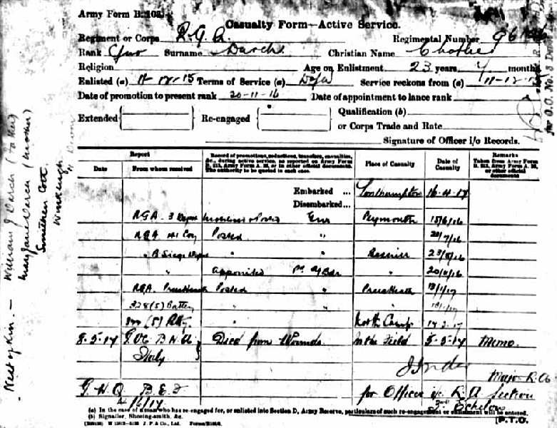 It is possible of course, but we cannot know for certain, that Charlie either did not attest at first, or perhaps he appealed and was turned down. The strong appeal of the Derby Scheme was that men who had previously volunteered or who now attested could choose the branch of the services in which to serve, in contrast to conscripted men who had no choice at all. Charlie hesitated and then decided: just four days before the scheme closed he attested. His choice was for the Royal Garrison Artillery, involved among other theatres of war in coastal defence, with one of five recruitment depots in Plymouth. Much safer than the infantry or even the Field Artillery, the RGA offered a possible home defence service or at worst a much safer war. It was a clever choice.