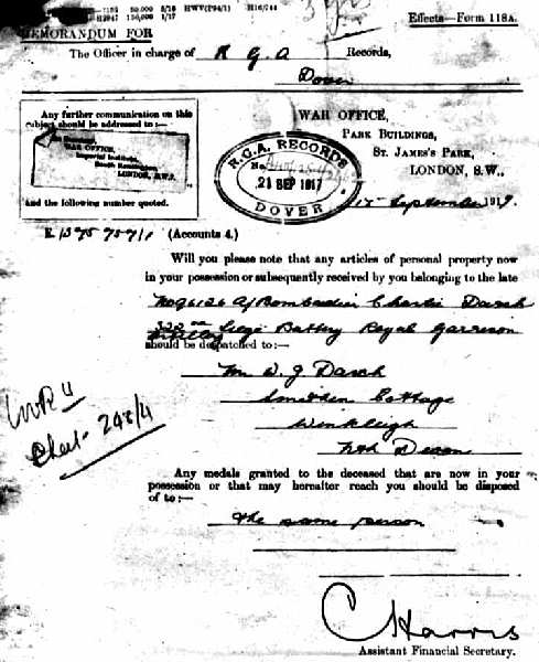 The official letter to next of kin, informing William and Mary Jane of Charlie’s death was not despatched until a month later on 7th June (an indication of the volume of work passing through the Royal Artillery Records Office) and the order to send his effects to the parents at Smithen Cottage, Winkleigh, followed on 15th June. An order to settle Charlie’s pay up to the date of death was made to the Regimental Paymaster from 322 Battery on 4th October, and was received on 1st December 1917.