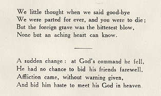It is more than likely that Charlie’s parents made the request that was so earnestly desired after the war by so many, that his body should be returned to his family in Winkleigh, but no exceptions could be made to the rule. Instead the Director-General of Graves Registrations of the then Imperial War Graves Commission authorised photos to be taken of the cemetery at Gradisca and Charlie’s grave, and sent with an acknowledgement to the family. Preserved too is the memorial card sent by the loving parents to friends and relatives, containing the inscriptions and a poem: