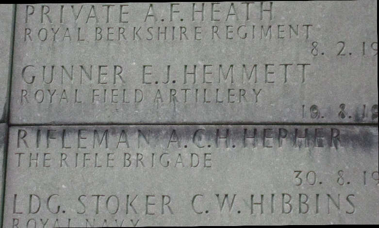 Ernest John Hemmett. Son of the late John and Elizabeth Hemmett, of Winkleigh, Devon. Commemorated on Screen Wall reference 89, No. 32452 at Nunhead (All Saints) Cemetery.