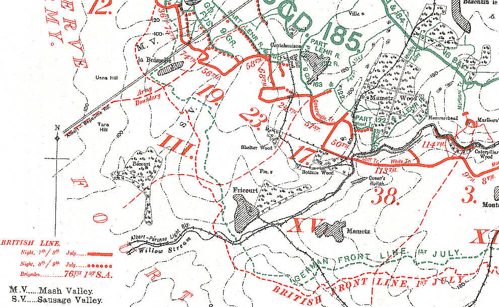 The final bombardment opened at 0625 hrs on July 1st, with the infantry going over the top at 0730. During the first day the 12th Battery fired 850 rounds, which included both gas and high explosive shells. By the end of the first day the 7th Division had captured Mametz and had put out a flank to cover Fricourt, at the cost of 3,410 casualties. The advance just west of Fricourt involved three Divisions: on the left the 7th with the 18th on their right and on the right of the 18th the 30th at which point the British line joined that of the French. Click HERE to display the Mametz map for the 2nd July. Montauban was captured by the 30th Division by 1.30 pm with severe loss, and along the front line of the three Divisions the field artillery was pushed up to the old British front-line. The 35th Brigade had advanced past Mansell Copse, but further progress was held up because bridges were needed for horses and guns to cross the German trenches. The map shows the targets of the 35th Brigade in the first 10 days of the battle.
