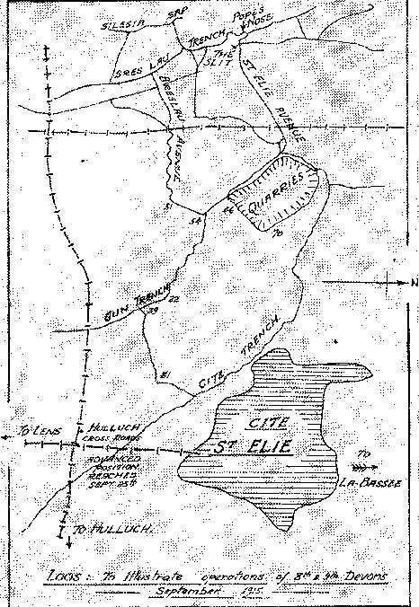 The 7th Division attacked just north of the centre axis of the battle, the Vermelles to Hulluch road. In an attempt to compensate for the impossibly difficult terrain gas was to be used for the first time in ‘retaliation’ for the first use of gas by the Germans in April at 2nd Ypres. The wind was far from promising but on the whole the 7th Division found it useful at first. The so-called ‘smoke-helmets’ in which the infantry had to advance were almost too constricting to breathe, however, and led many men to remove them, causing casualties. 20th Brigade were caught by German shelling in No-Man’s Land, and found much of the wire uncut, but Gun Trench (which curved back from the German front-line to the Vermelles-Hulluch road) was captured and two batteries of the RFA were brought forward just behind the original front line to assist the advance towards Hulluch, near the wayside shrine of Notre Dame de la Consolation and were in action by 9.00am (see Cité St. Élie map on the right). Although the Hulluch Quarries were captured and patrols reached the edge of Cité St. Élie, further advance was not possible against the uncut wire in front of Hulluch, despite the constant shelling that lasted until 4.00pm. The Division had achieved all that could possibly be expected of it.