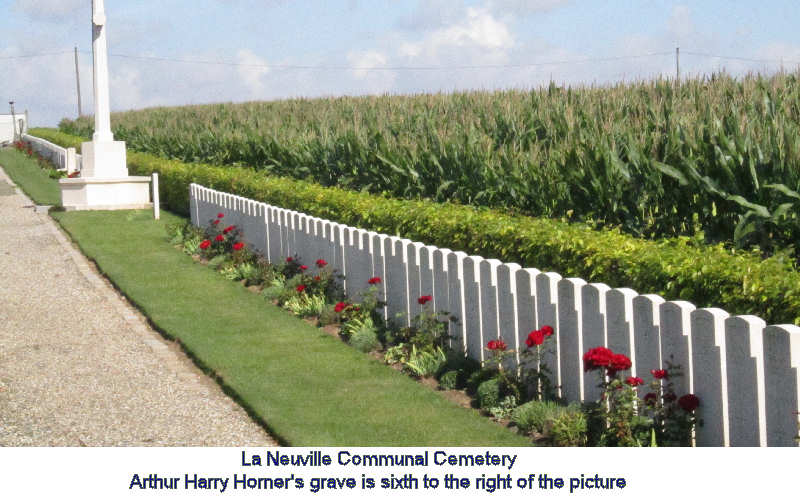 Battle orders of the 20th Infantry Brigade for July 1st indicate that for their part of the line the 8th Devons Aid Post was at Wellington Redoubt and the Advanced Dressing Station at The Citadel. The Divisional Collecting Post was near Orchard Camp on the Bray-Albert Road These was already in the process of being set-up in readiness, but it is much more likely that Arthur Horner was taken by a direct route to the nearby Casualty Clearing Station at Corbie along the road that follows the Somme river due West. Corbie is a village 15 kilometres south-west of Albert and approximately 23 kilometres due east of Amiens. La Neuville Communal Cemetery is north of the village. In April 1916, No.21 Casualty Clearing Station came to La Neuville and remained there throughout the 1916 Battles of the Somme, until March 1917. La Neuville British Cemetery was opened early in July 1916, but at first burials were also made in the communal cemetery. Most of these date from this period, but a few graves were added there during the fighting on the Somme in 1918. In all, the communal cemetery contains 186 Commonwealth burials, all identified casualties, and form one long row on the eastern side of the cemetery.