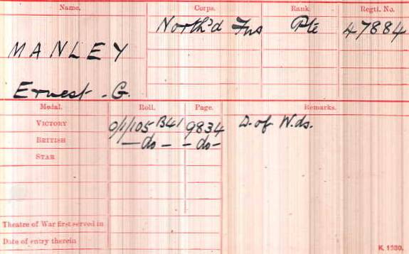 Private Ernest George Manley, killed in action in France. A native of Colyton he removed to Winkleigh about 18 years ago and served his apprenticeship with Mr. C. Mitchell, builder. He joined the staff of Messrs. Blatchford and Dawe, builders, Okehampton about six years since, joined the Royal Engineers early in 1916 and was subsequently transferred to the Northumberland Fusiliers. In 1913 he married the eldest daughter of Mr. and Mrs. E. J. Saunders, photographers of Winkleigh. A Memorial Service was held in the Parish Church, conducted by the Rev. T. A. Edmonds. A muffled peal of bells followed the service.