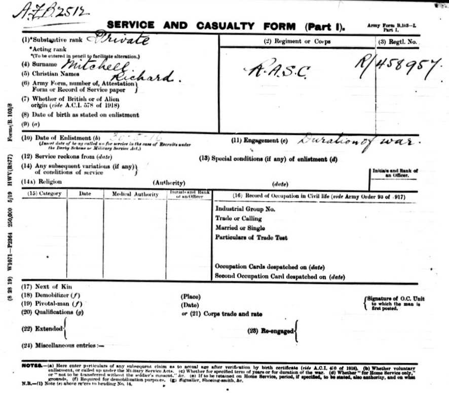 The six sets of documents available to us which trace the story of Richard Mitchell’s enlistment, service record, illnesses and disability, and his final demobilization have been placed on this site. Together they allow us to discover in considerable detail his life during the war. There are 5 sections of documents: