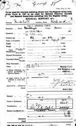 The documents concerning his application in 1919 (Section 5) acknowledge the bronchial pneumonia in 1916, and record Richard’s statement that he still has pain in his left side, still feels out of breath with difficult respiration, and that he was coughing white flam in the mornings. The examination recorded that his general condition was ‘soft and obese’. The heart showed no enlargement and no murmur. His pulse was 72 and blood pressure 104 over 96. His teeth were ‘deficient and defective’ but this was not attributable to army service. Lungs showed no obvious adverse signs, though there was vibration in the left base. His reflexes were normal but with a slight tremor in the hands. His mental attitude was described as ‘sluggish mentally and physically’.