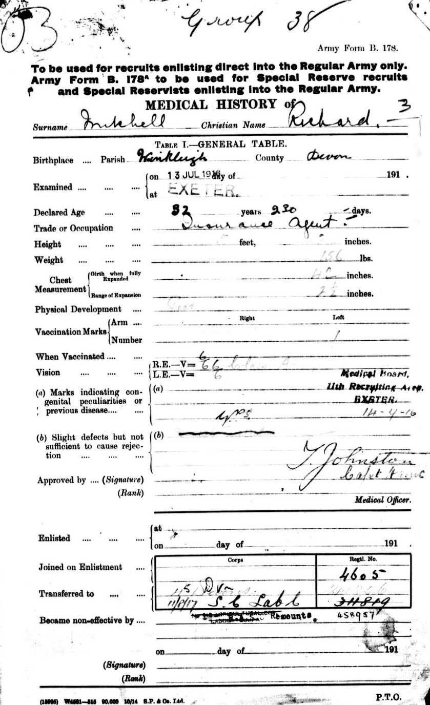 Richard Mitchell’s papers show that having registered, he was attested under the Derby scheme at the last possible moment, 30th May 1916, a mere five days after the conscription act became law. Registration under the Derby scheme, secured him (as was promised) the regiment or arm of his choice. By contrast, other Winkleigh men who avoided the Derby scheme and waited until conscripted, found themselves serving in regiments stationed far from home. For Richard, service in the Devons, based in Exeter, was obviously the most attractive proposition (Section 2).
