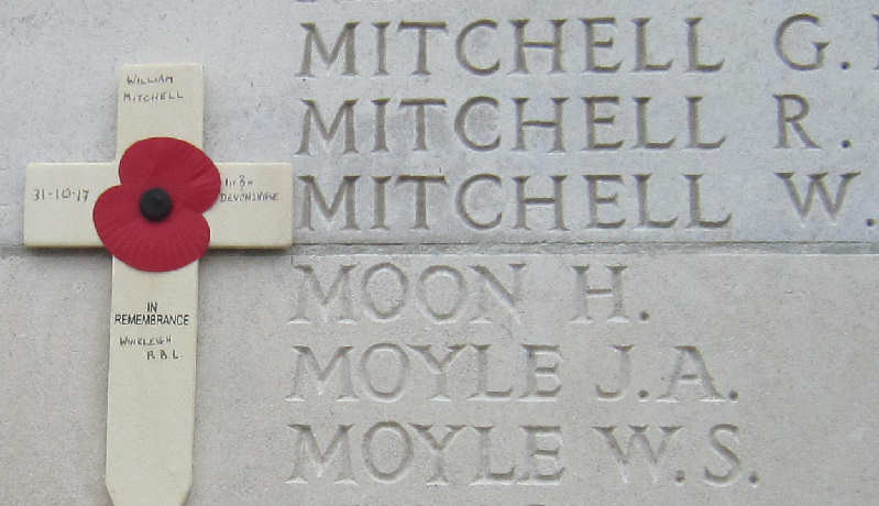 Destroyed by a shell, there were no remains to bury. Instead, William’s name is commemorated on the Tyne Cot Memorial to the missing, (on the Devonshire Regiment panels 38-40 in the North Rotunda, left of the entrance), located 9 kilometres north east of Ypres town centre, on the Tynecotstraat, (a road leading from the Zonnebeekseweg, the N332). The site marks the furthest point reached by Commonwealth forces in Belgium until nearly the end of the war. The Tyne Cot Memorial bears the names of almost 35,000 officers and men whose graves are not known, and who died between 1917 and the end of the war, for the most part in the Ypres salient. The memorial forms the north-eastern boundary of Tyne Cot Cemetery which was established around a captured German blockhouse or pill-box used as an advanced dressing station. The original battlefield cemetery of 343 graves was greatly enlarged after the Armistice when remains were brought in from the battlefields of Passchendaele and Langemarck, and from a few small burial grounds. It is now the largest Commonwealth war cemetery in the world in terms of burials. At the suggestion of King George V, who visited the cemetery in 1922, the Cross of Sacrifice was placed on the original large pill-box. There are three other pill-boxes in the cemetery. There are now 11,956 Commonwealth servicemen of the First World War buried or commemorated in Tyne Cot Cemetery, and of these 8,369 are unidentified.
